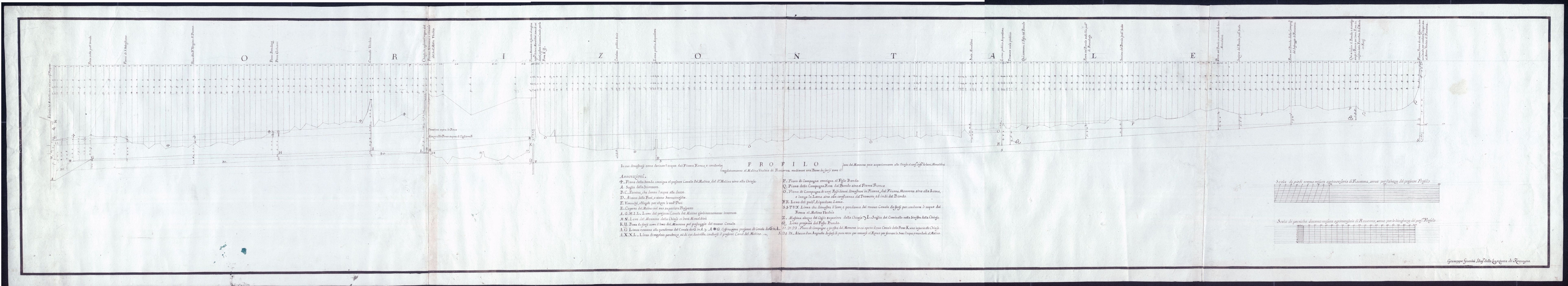 Sul verso: �Profilo dimostrativo come derivare le acque del Ronco, e condurle al Molino Vecchio con botte sotto il montone superiormente alla Chiusa � del capitano Giuseppe Guarini Idrostatico della Legazione di Romagna�