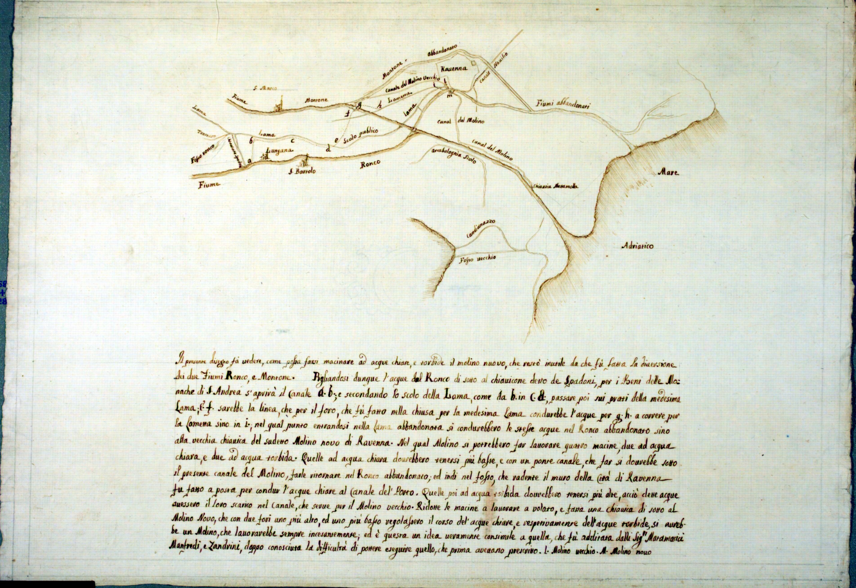 Pianta relativa al progetto di far macinare ad acque chiare e torbide il molino nuovo che rest� inutile dopo la diversione dei fiumi Ronco e Montone, pigliando le acque dal Ronco di sotto al chiavicone detto de' Spadoni per i beni delle monache di S. Andrea aprendo un canale passar sui prati della Lama, fare una chiusa sulla Lama, condurre le acque per la Lametta e entrare nel letto abbandonato del Ronco. Con un fascicolo di 4 carte con lezioni