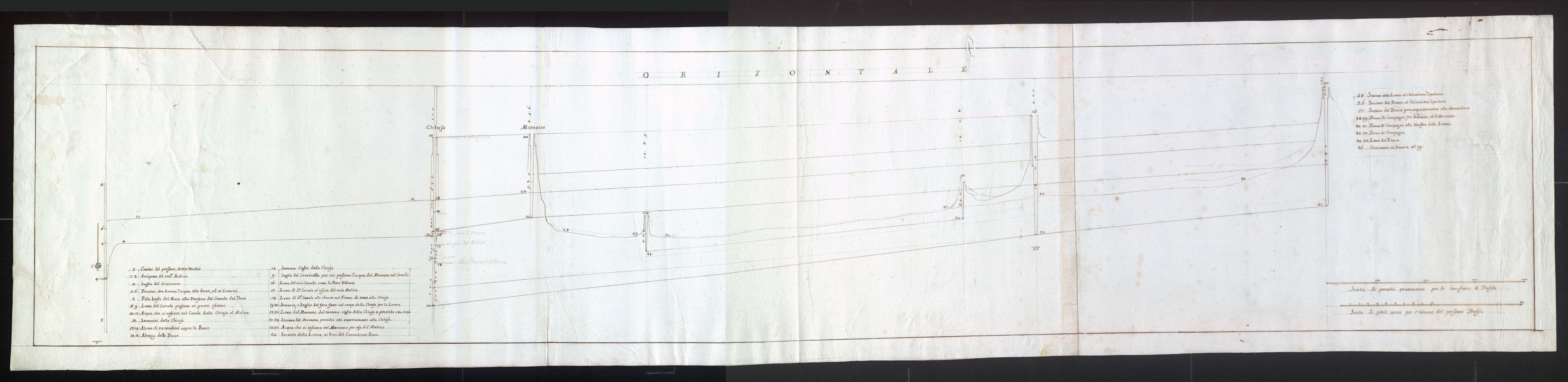 Profili e altimetria del canale e della chiusa del molino vecchio, della Lama e del Ronco