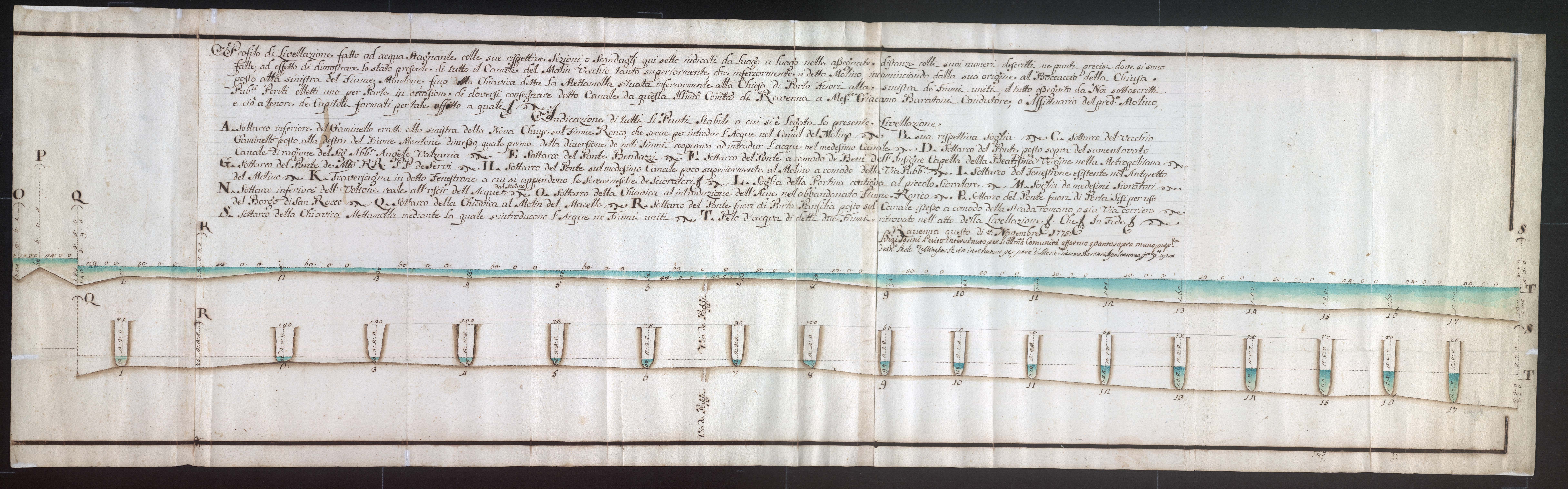 Profilo di livellazione del molino vecchio cominciando dal braccio della chiusa posto sotto alla sinistra del fiume Montone fino alla chiavica detta la Mettamolla situata inferiormente alla chiesa di Porto Fuori alla sinistra dei Fiumi uniti