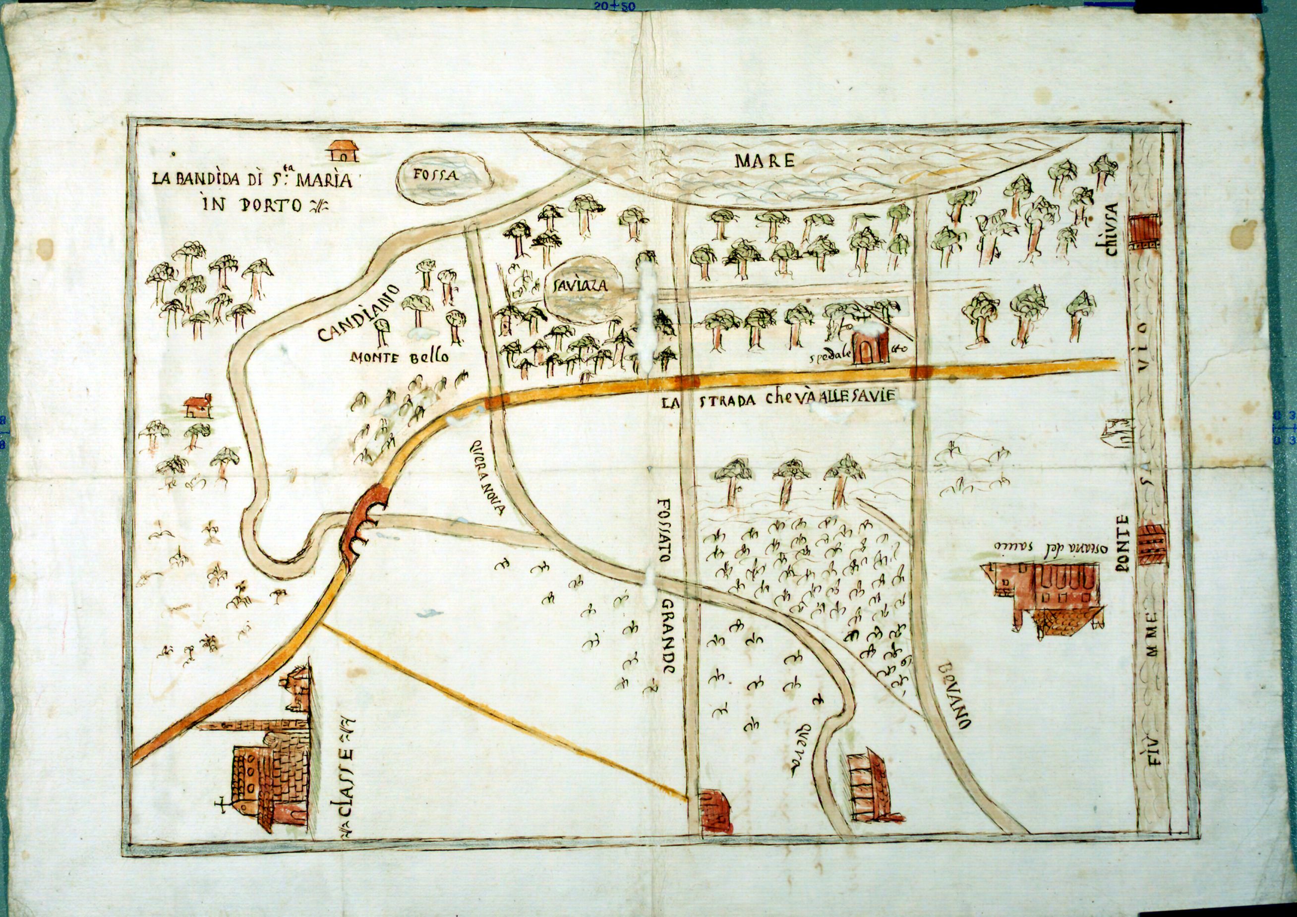Pianta per la lite del termine piantato dai PP. di Classe di l� della Via Lunga verso il Bevano. (Mare, La Bandita di Porto, Candiano, Montebello, Classe, ponte della strada che va al Savio, Acquara nova, Spedaletto. Pineto, Saviazzo. Fossato grande, Bevano, Savio)