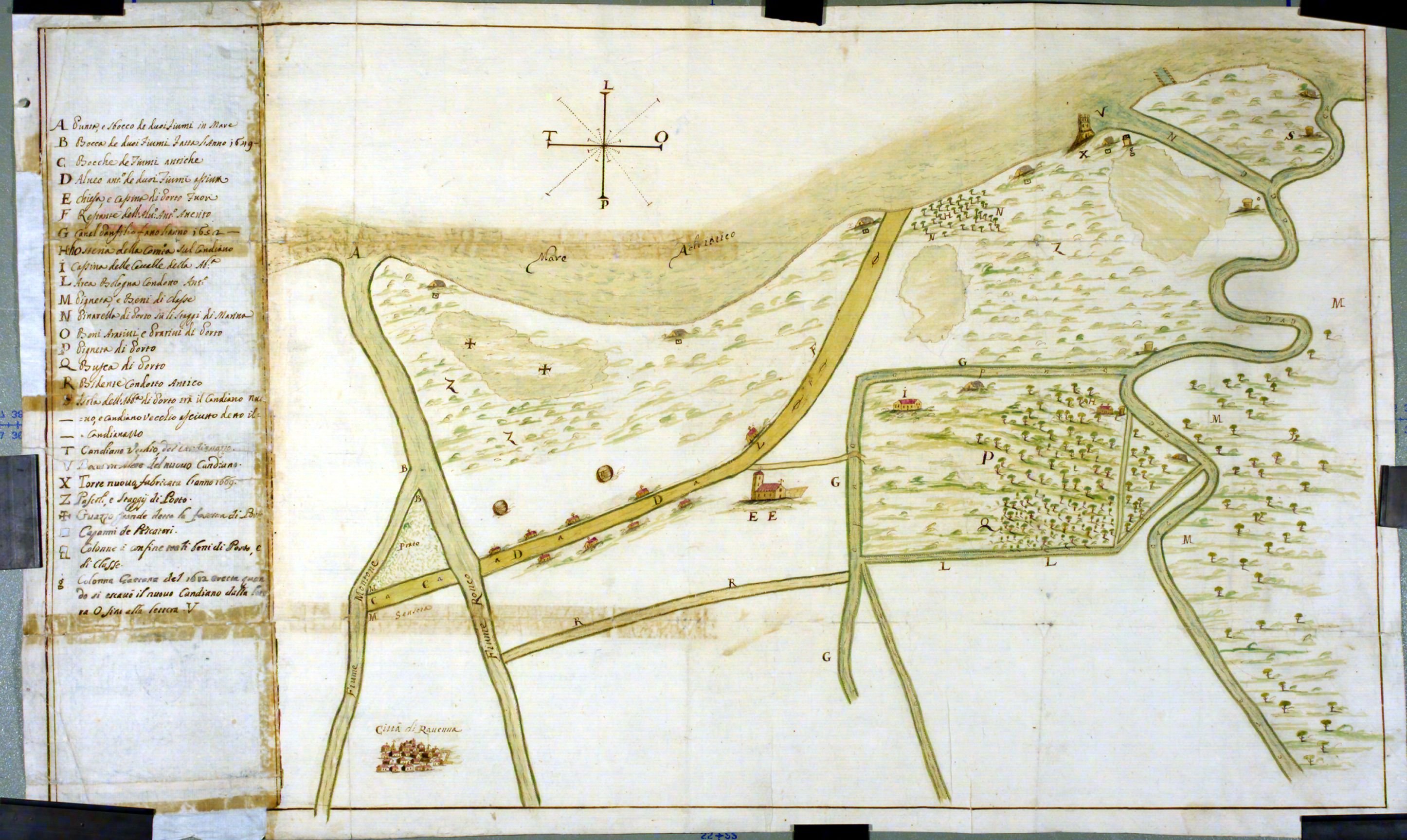 Pianta degli sbocchi in mare dei fiumi Ronco e Montone, del Canal Panfilio, del Porto Candiano; Pinete di Classe e di S. Maria in Porto; pascoli; Fossina; Torre Gaetana del 1612; Torre Nuova del 1669; scoli; Arcabologna con relazione perizia di P. Azzoni e figura della Torre del Porto Candiano