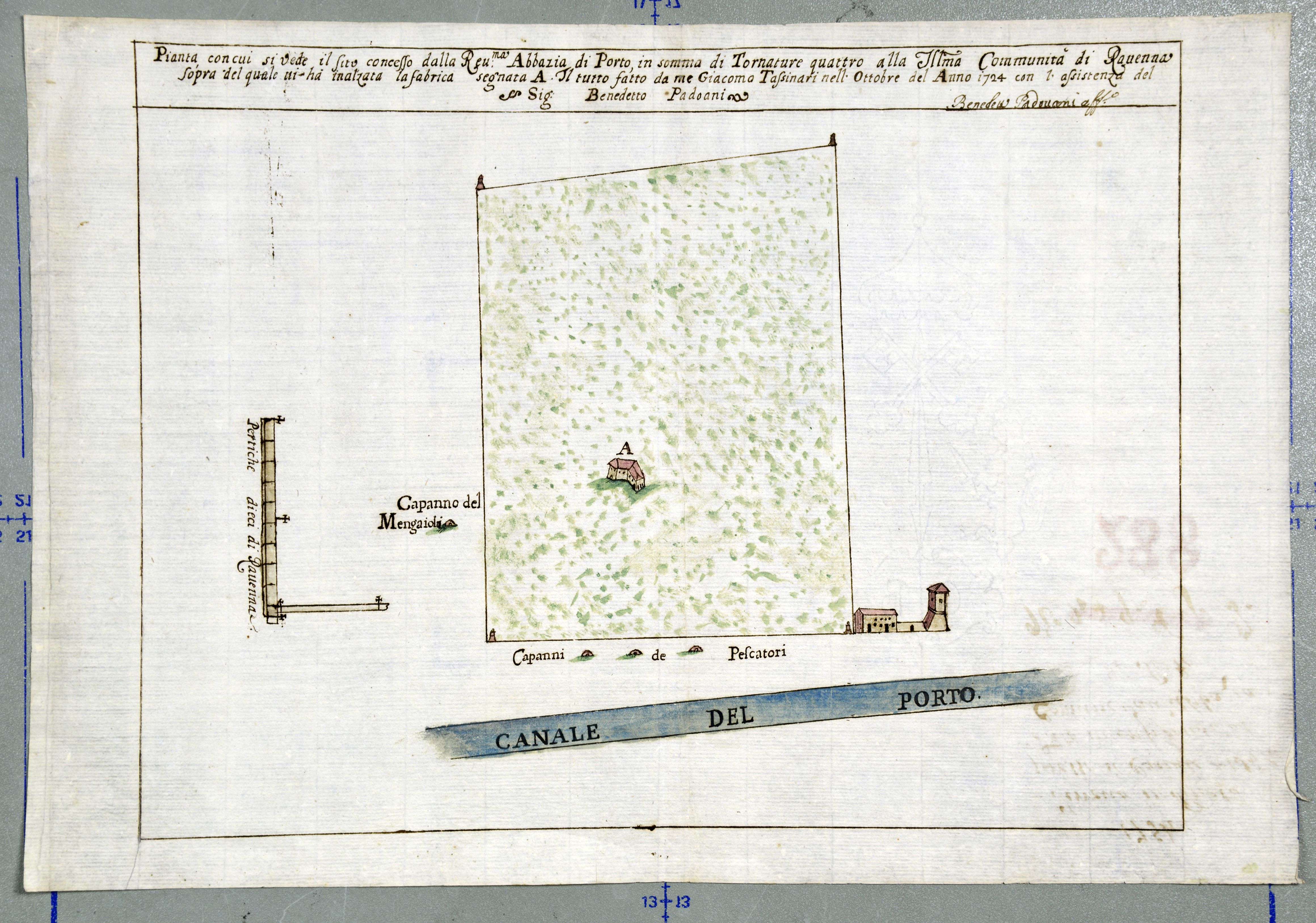 Pianta con cui si vede il sito concesso dalla Abbazia di Porto in somm.a di tornature quattro alla illustrissima comunit� di Ravenna sopra del quale vi a [sic] inalzata la fabbrica segnata A (osteria presso la foce del Porto Candiano)