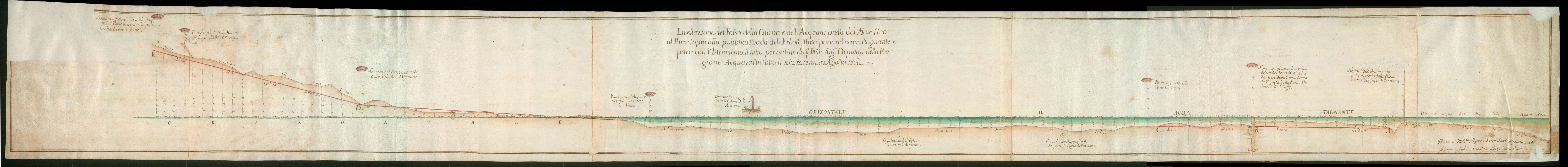 Livellazione del Fosso della Giara e dell'Acquara presa dal mare fino al ponte sopra alla pubblica strada Erbosa fatta parte ad acqua stagnante e parte con l'istrumento il tutto per ordine de' Sig.ri Deputati della Regione Acquara fin sotto li 11. 12. 13. 17. 22. Agosto 1762