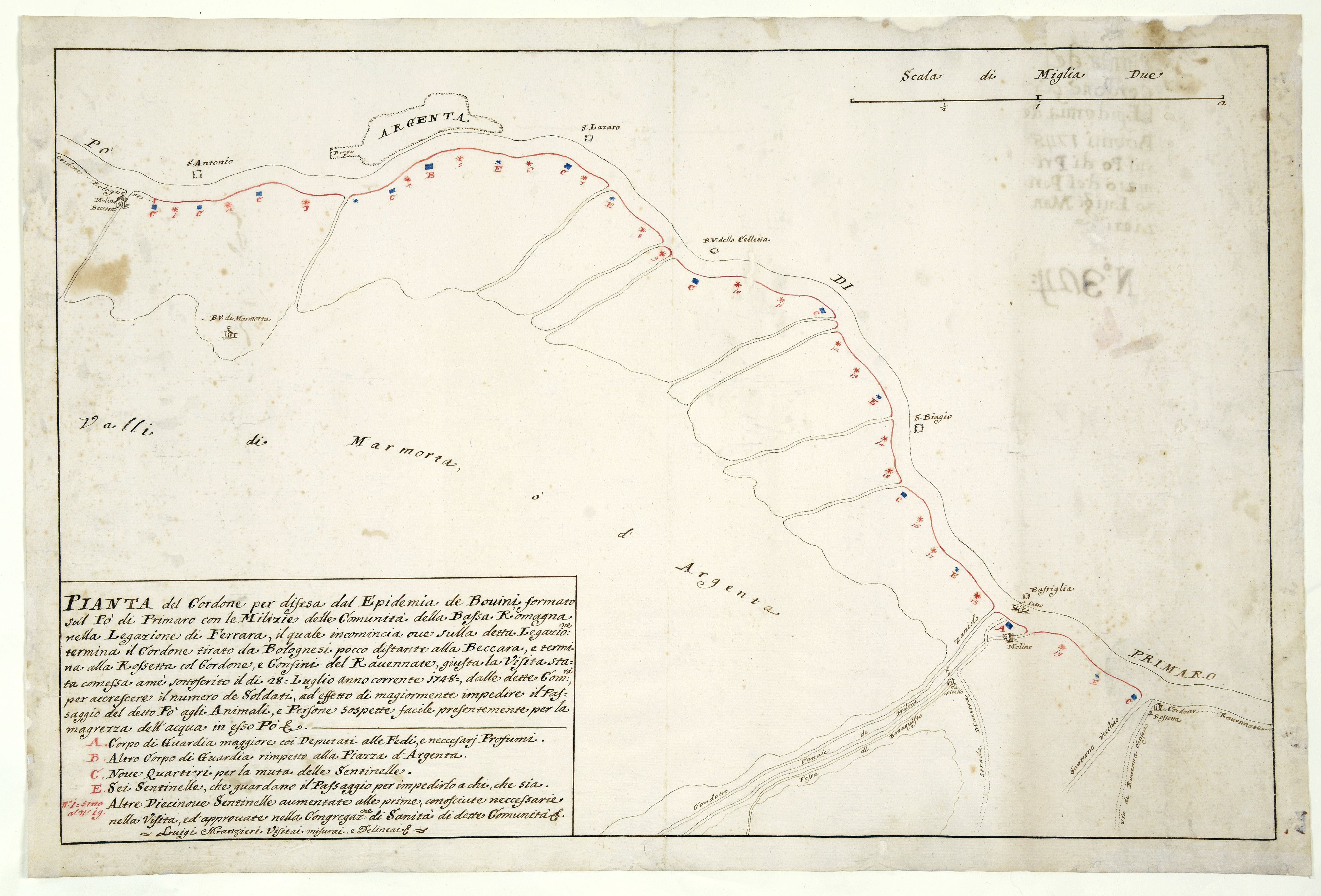 Pianta della parte dell'alta Romagna legazione di Ravenna che confina con quella di Bologna e Ferrara dimostrante il cordone ultimamente tirato sulla prima a difesa di essa dall'infezione dell'Epigorzia de' Bovini affetti su buona parte del Bolognese e quasichè tutto il Ferrarese e di quello che indilatamente la buona custodia richiede piantare per maggior sicurezza nella detta legazione di Ravenna col numero di soldati occorrenti alla guardia di esso fatto, ad istanza de' nobili signori dell'illustrissimo magistrato della città di Faenza nel corrente bimestre di settembre e ottobre 1748 da me infrascritto Geometra Perito computista della comunità di Lugo giusta la visita fatta de' confini della nominata legazione di Romagna riguardante a quei Paesi dell'altro che profondamente soggetti a simile infezione.