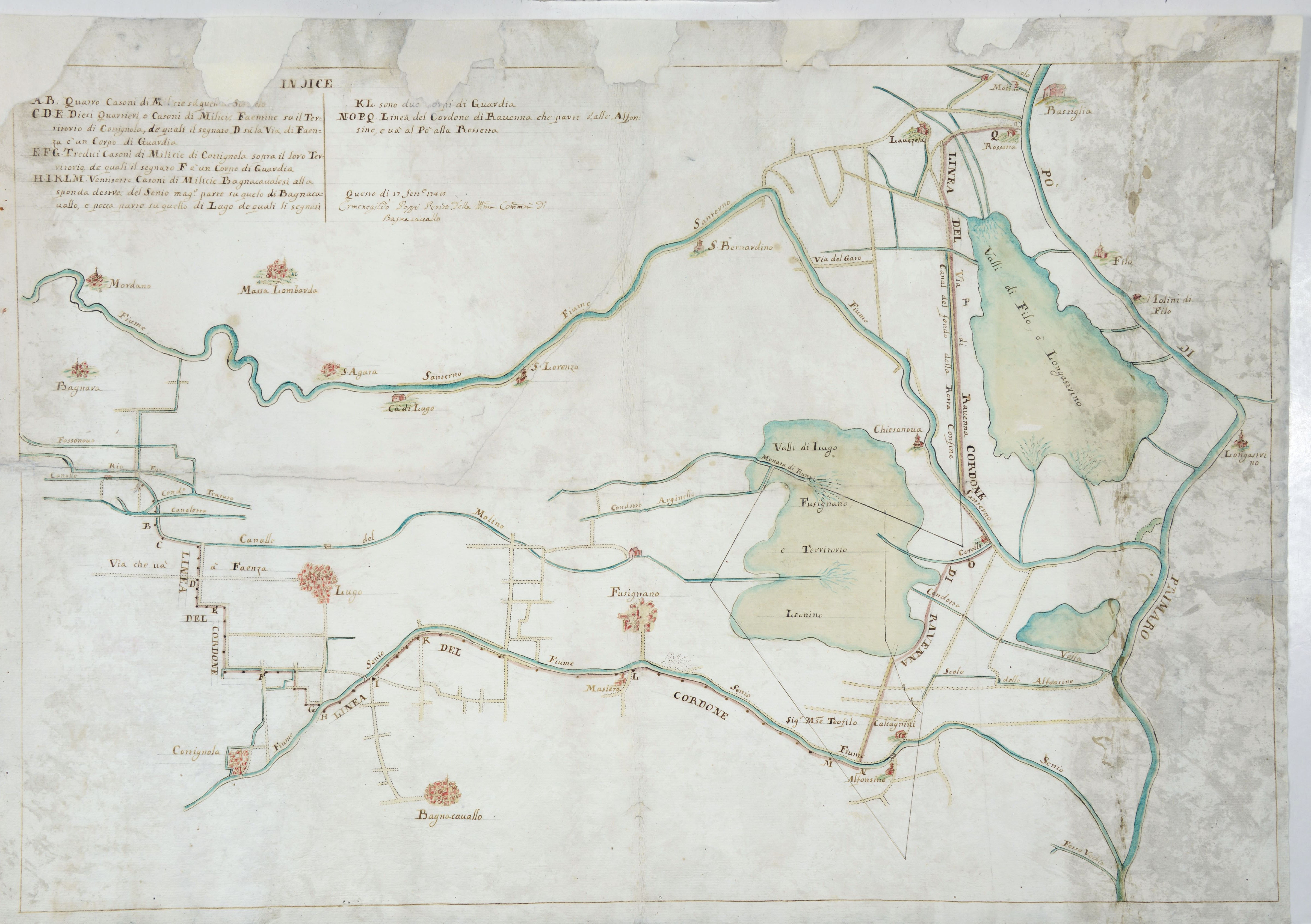 Pianta della parte dell'alta Romagna legazione di Ravenna che confina con quella di Bologna e Ferrara dimostrante il cordone ultimamente tirato sulla prima a difesa di essa dall'infezione dell' Epigorzia de' Bovini affetti su buona parte del Bolognese e quasichè tutto il Ferrarese e di quello che indilatamente la buona custodia richiede piantare per maggior sicurezza nella detta legazione di Ravenna col numero di soldati occorrenti alla guardia di esso fatto, ad istanza de' nobili signori dell'illustrissimo magistrato della città di Faenza nel corrente bimestre di settembre e ottobre 1748 da me infrascritto Geometra Perito computista della comunità di Lugo giusta la visita fatta de' confini della nominata legazione di Romagna riguardante a quei Paesi dell'altro che profondamente soggetti a simile infezione.