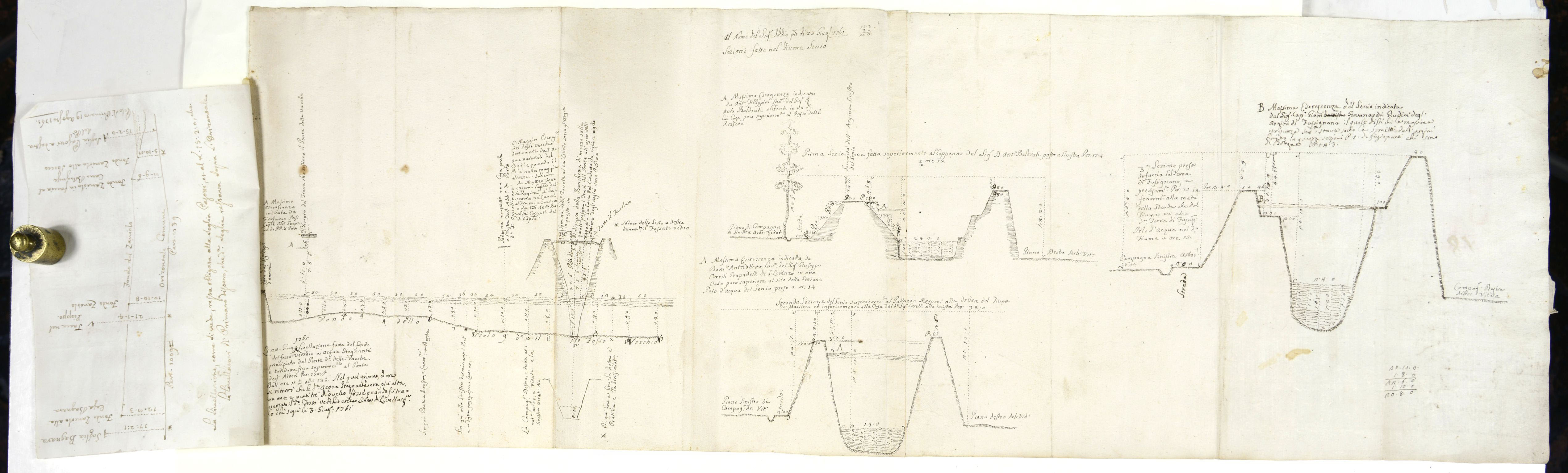 sul verso: "Le tre sezioni del Fiume Senio l'ultima delle quali si fece in dirittura della terra di Fusignano e livellazione del tratto di Fosso Vecchio del Ponte delle Vacche fino superiormente allo sbocco del Fossato Vedro Portiche