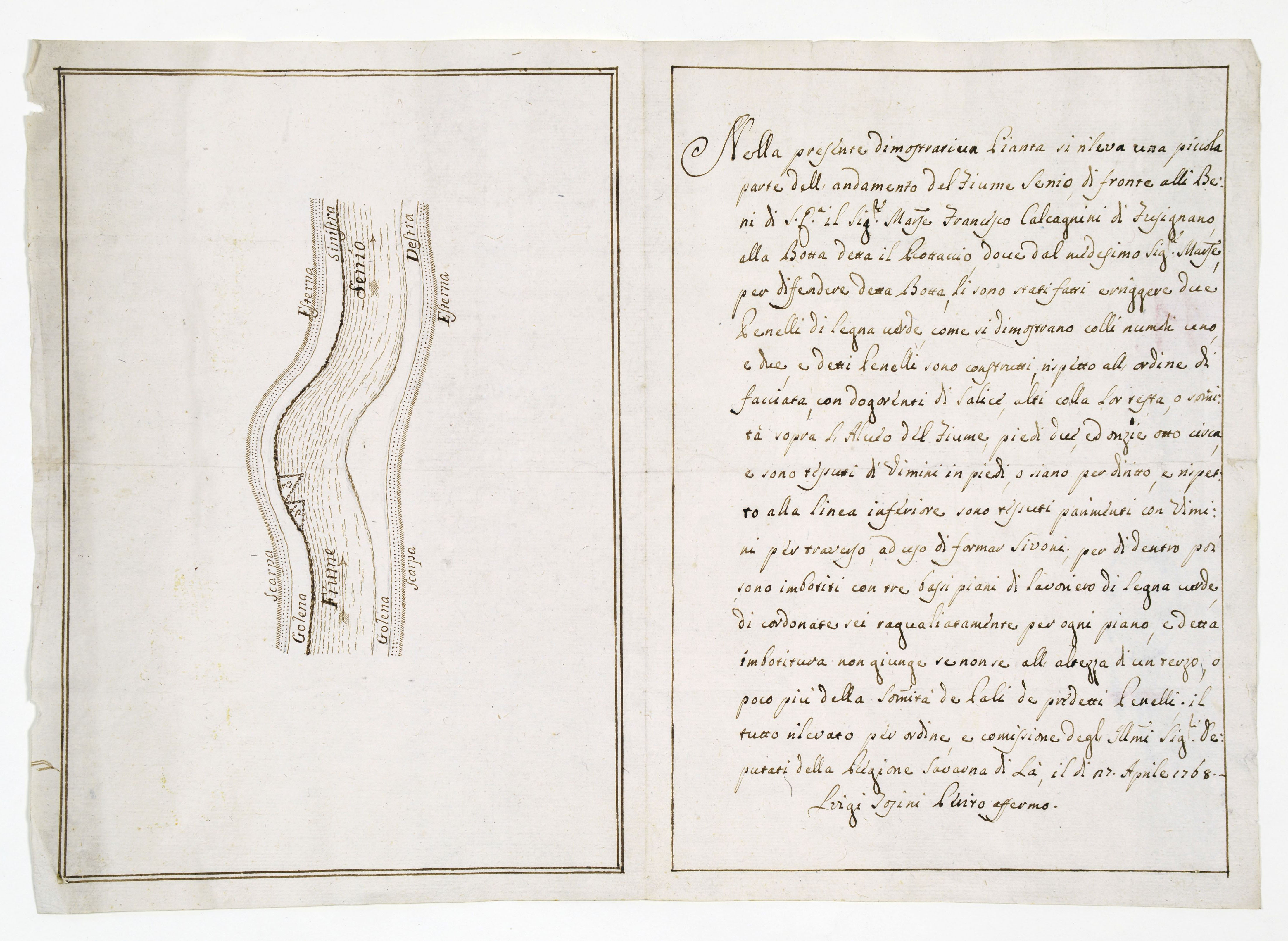 Pianta dimostrativa di una piccola parte del corpo del fiume Senio di fronte ai beni Calcagnini di Fusignano alla fossa detta il Rottaccio, con descrizione
