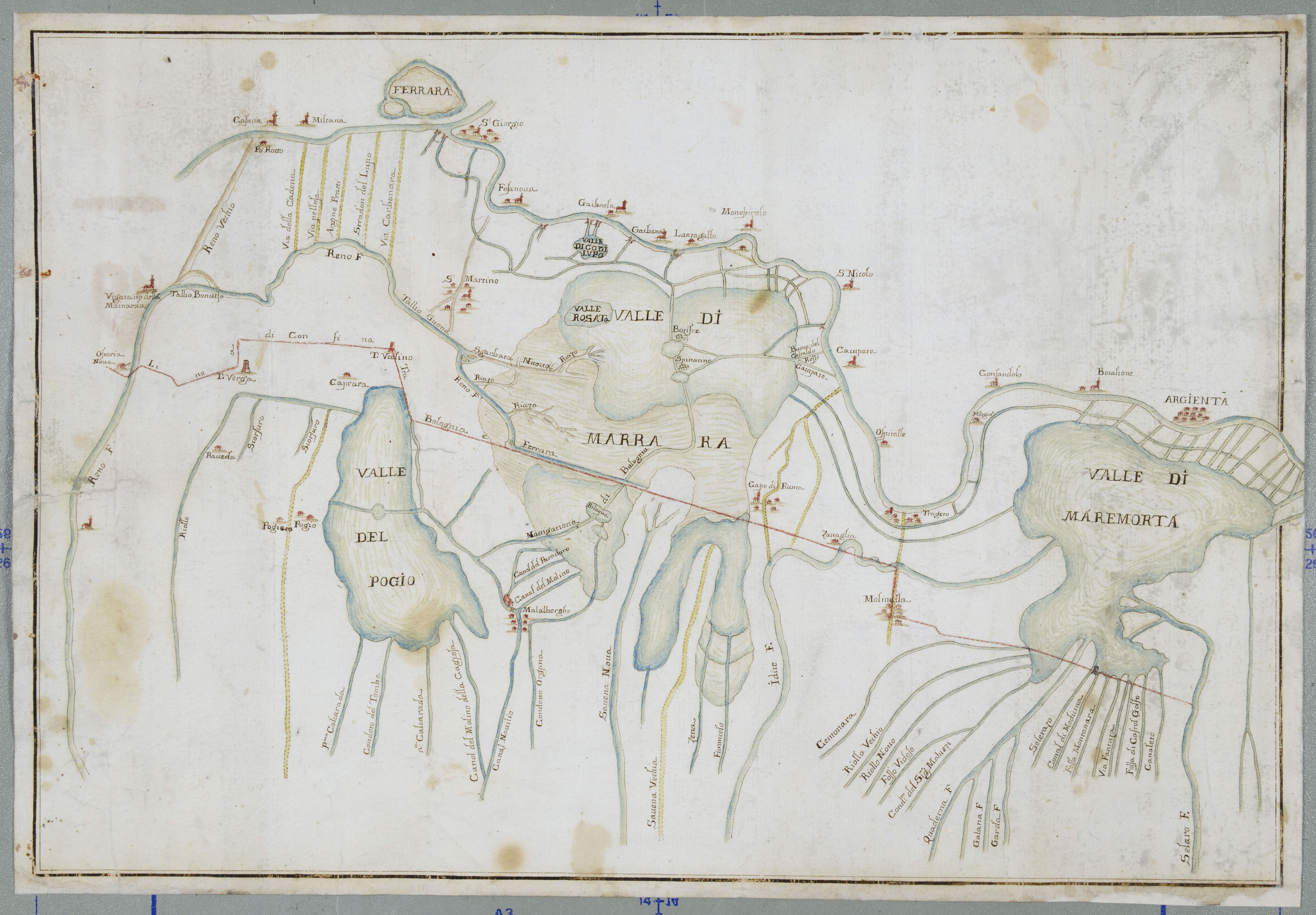 Pianta dimostrativa delle valli di Marmorta, di Codilupo, di Marrara e del Poggio tra Ferrara e Argenta.