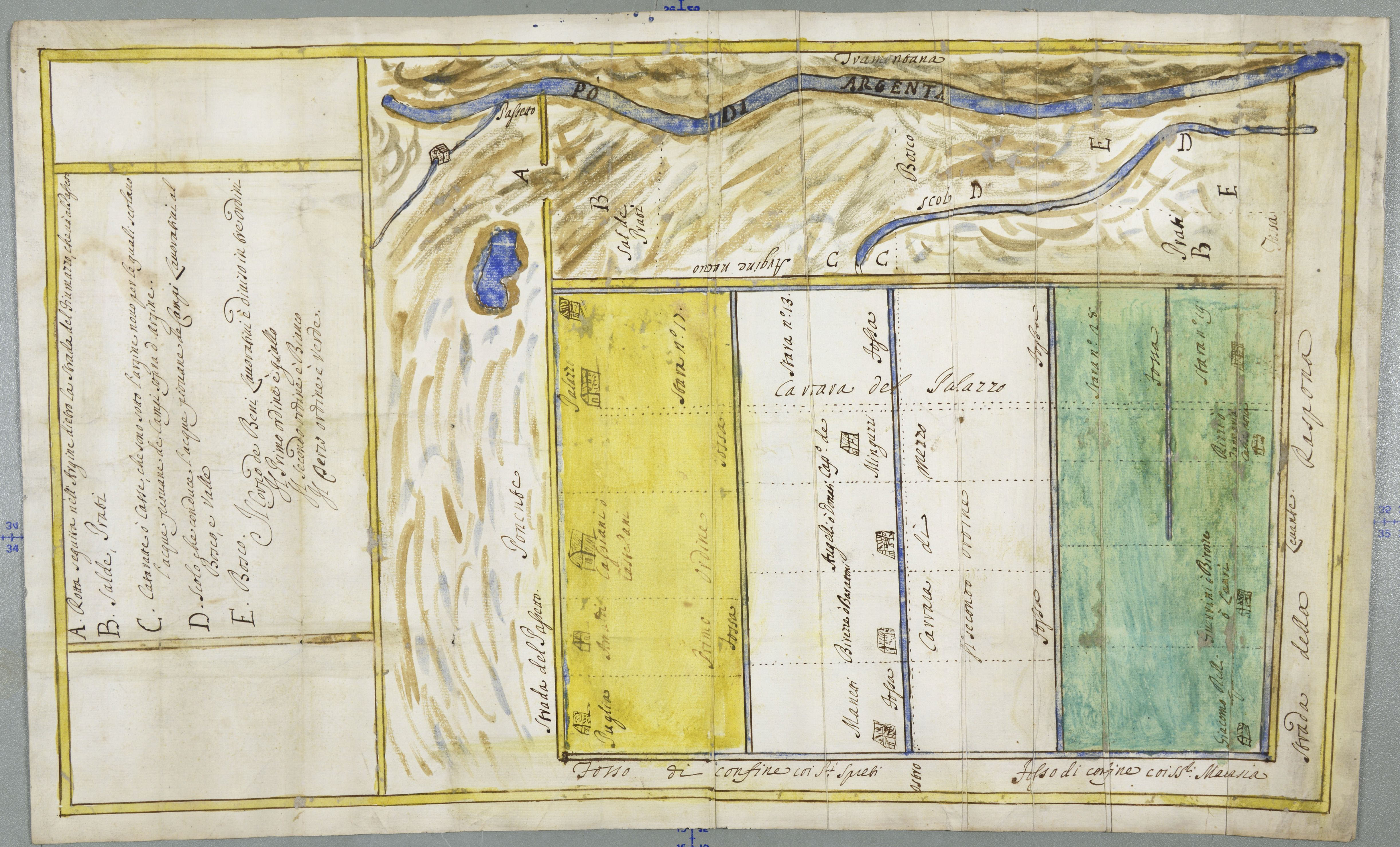 Po di Argenta. Rotta dell'argine presso la strada del Fiumazzo che va al Passetto. Prati. Cateratte o casse sotto l'argine nuovo per scolare le acque piovane dei campi sopra d'argine. Scolo che conduce le acque piovane de' campi al Bosco e valle. Strada Raspona.