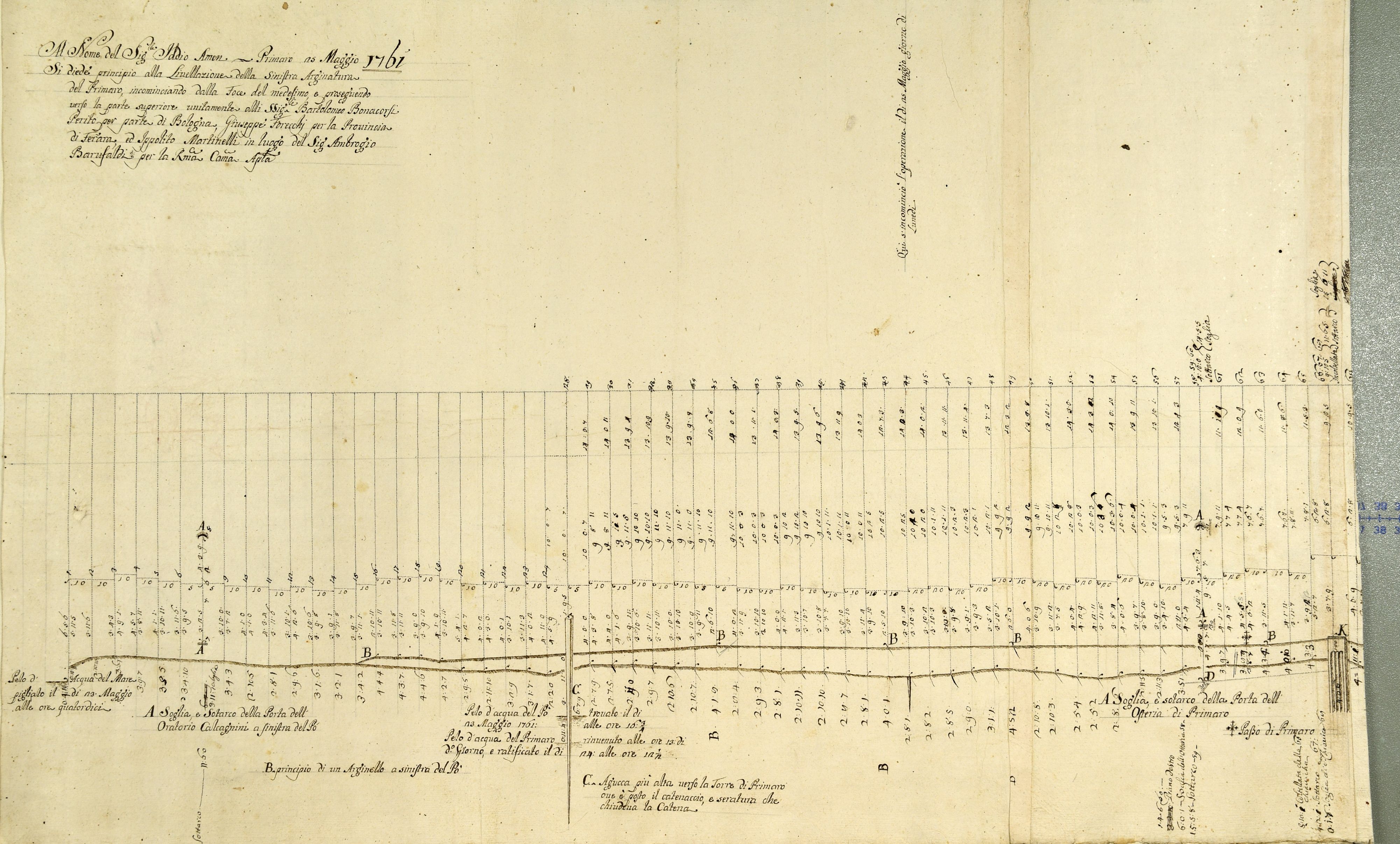 Profilo e livellazione della sinistra al Po di Primaro dal mare sino a S. Alberto con molte legature e piani della destra.