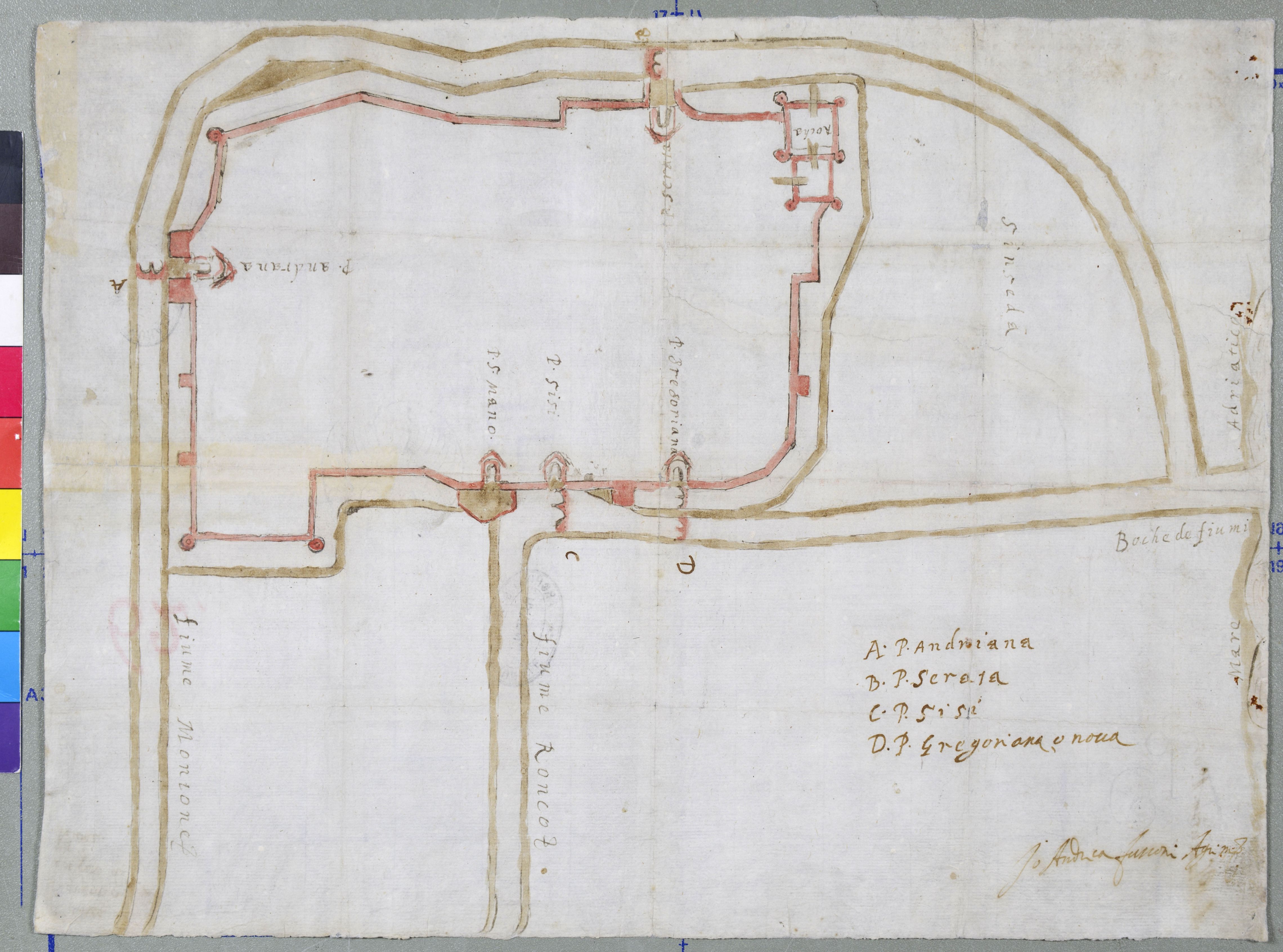 Pianta della città di Ravenna. (Sinseda, Rocca, Bocche de' fiumi, Porta Gregoriana o Nuova, Andriana, Serrata, Sisi, S. Mano)