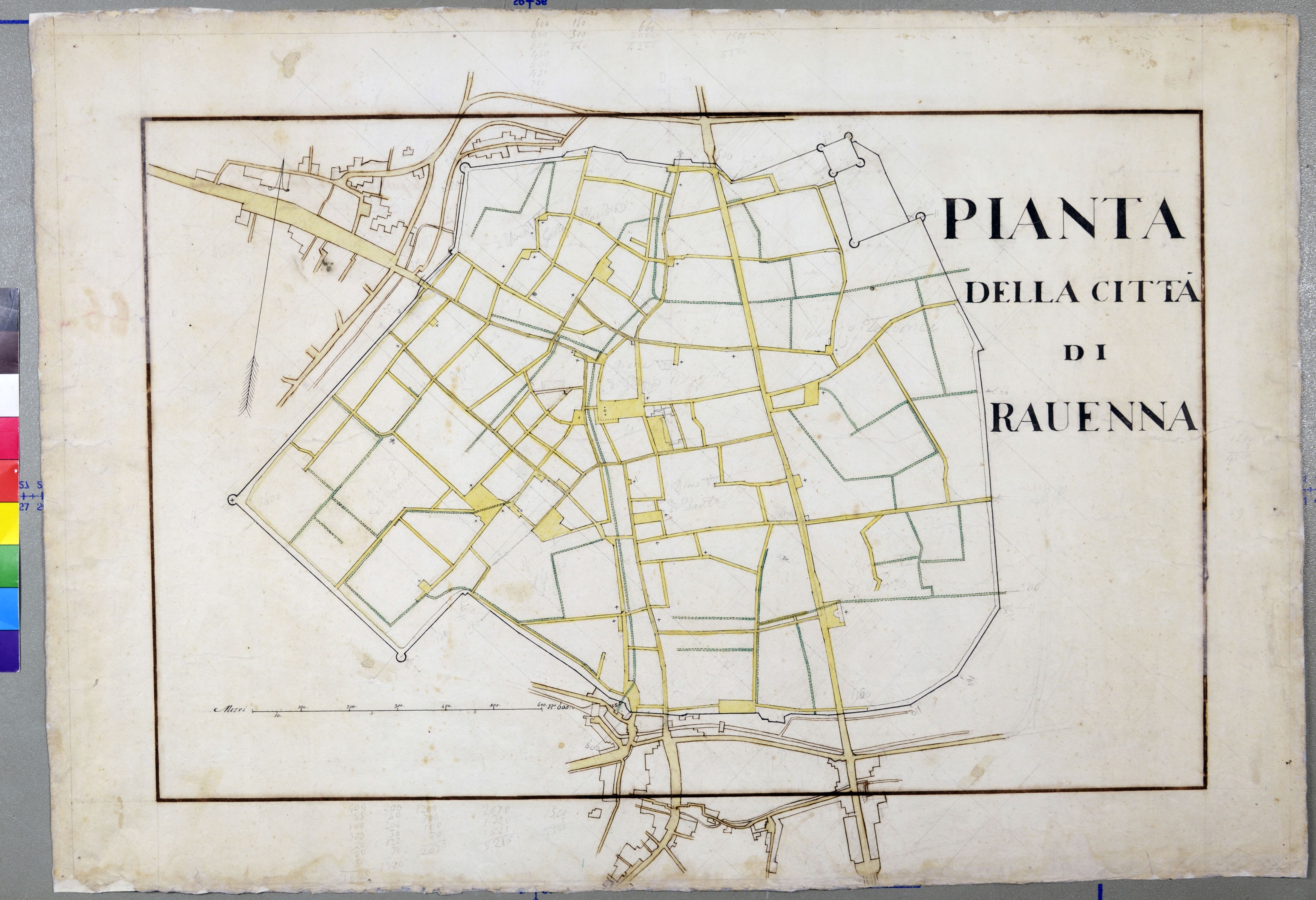 Pianta muta della città di Ravenna con le strade e gli scoli.