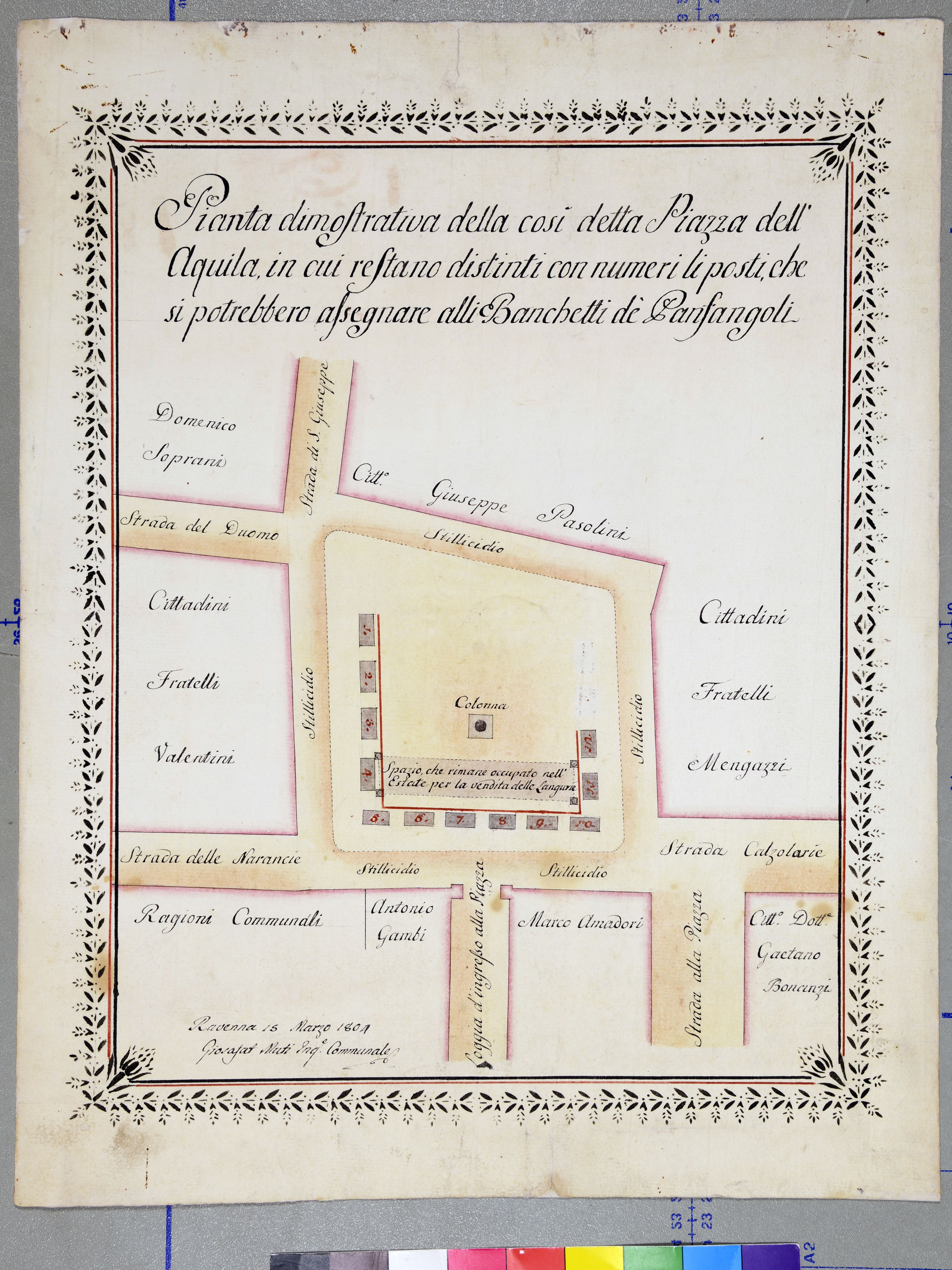 Pianta dimostrativa della così detta Piazza dell'Aquila in cui restano distinti con numeri li posti che si potrebbero assegnare alli banchetti de' Panfangoli.