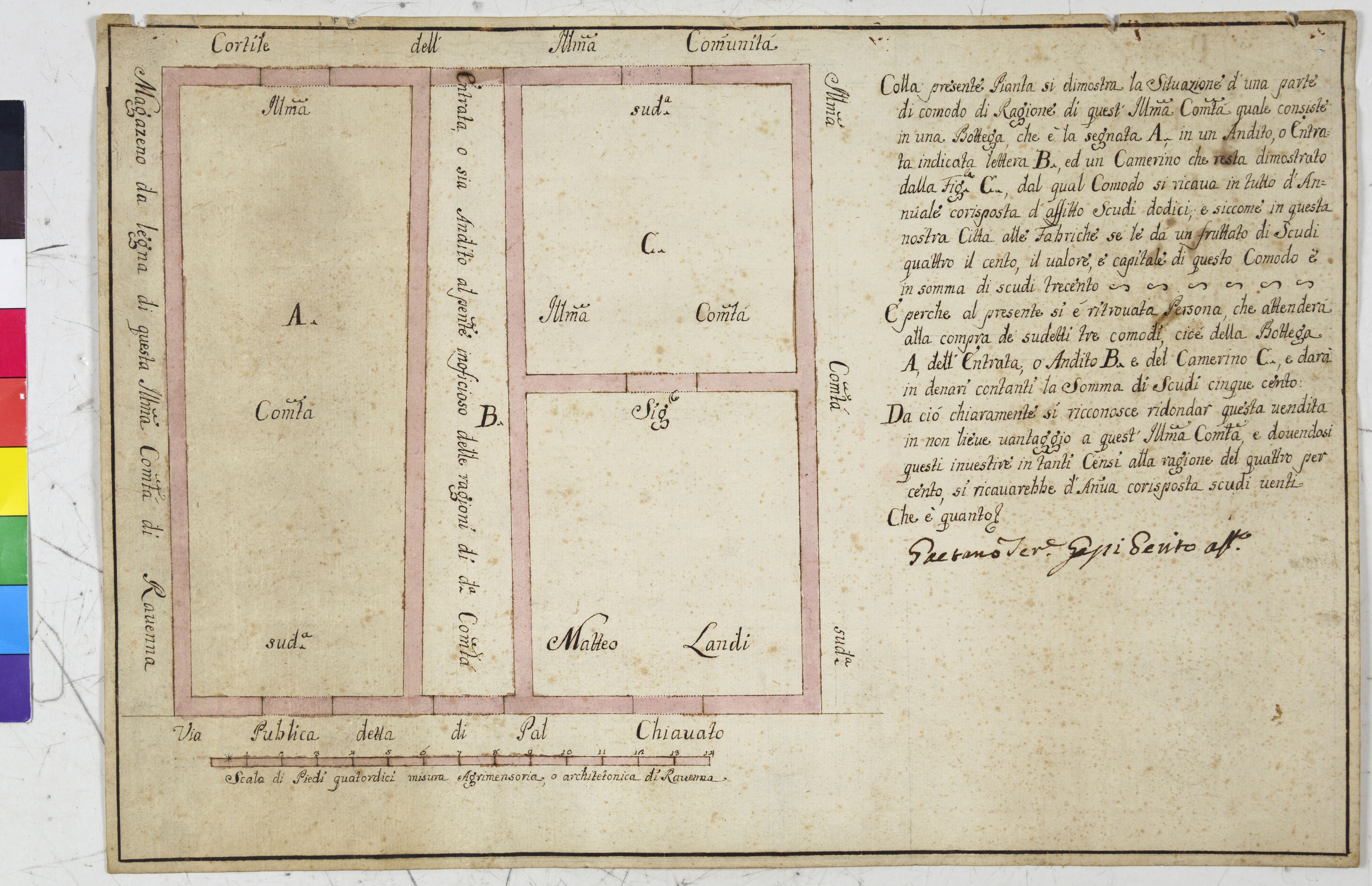 Pianta di parte di una bottega di proprietà comunale nella via Pal serrato in angolo col portico, e andito che va al cortile delle carceri.