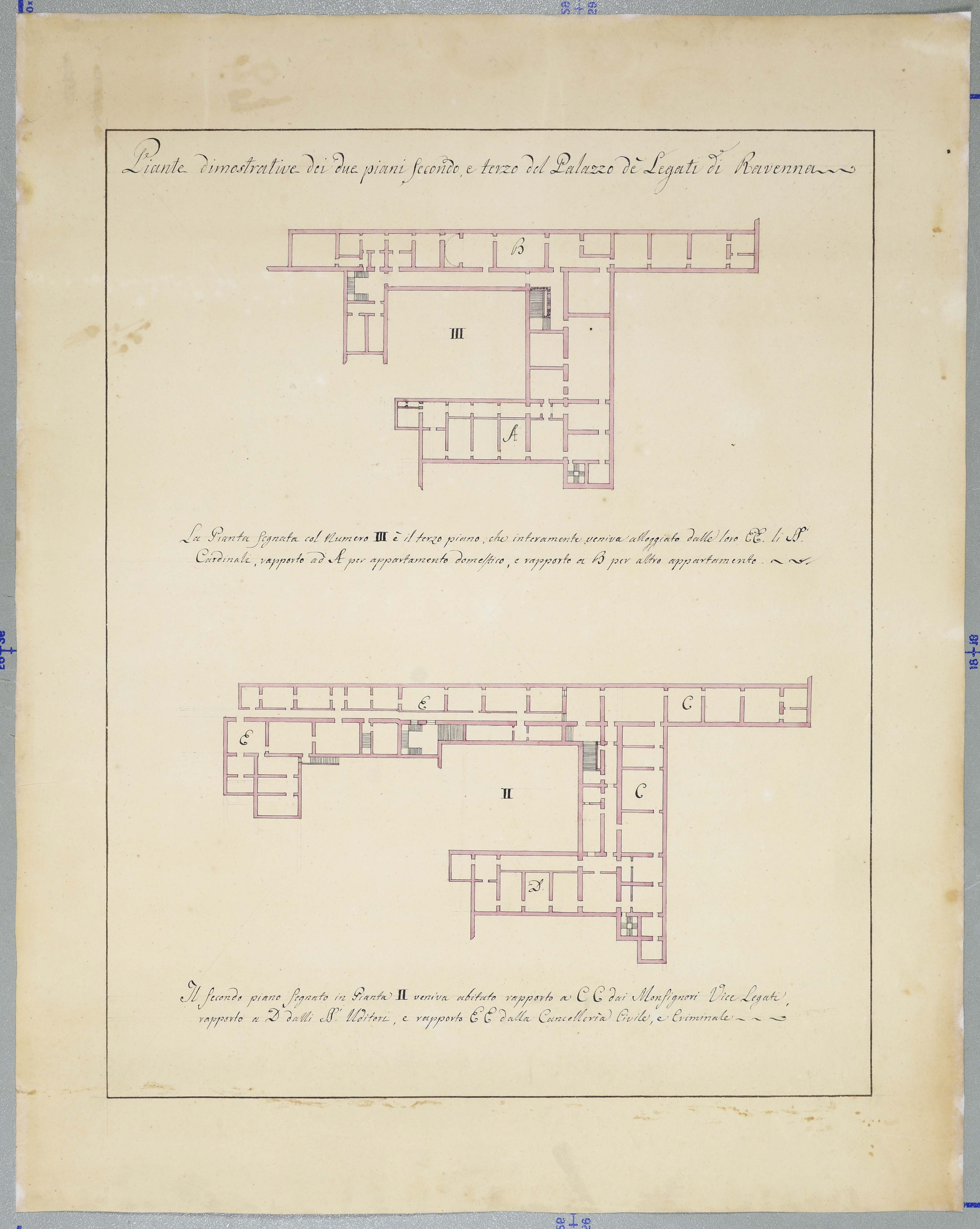 1. pianta del secondo e del terzo piano del palazzo apostolico 2. pianta dimostrativa degli uffici dei tribunali, della comm.issione economica e della capitaneria del Porto al pianterreno e quarto piano del palazzo dei Legati.