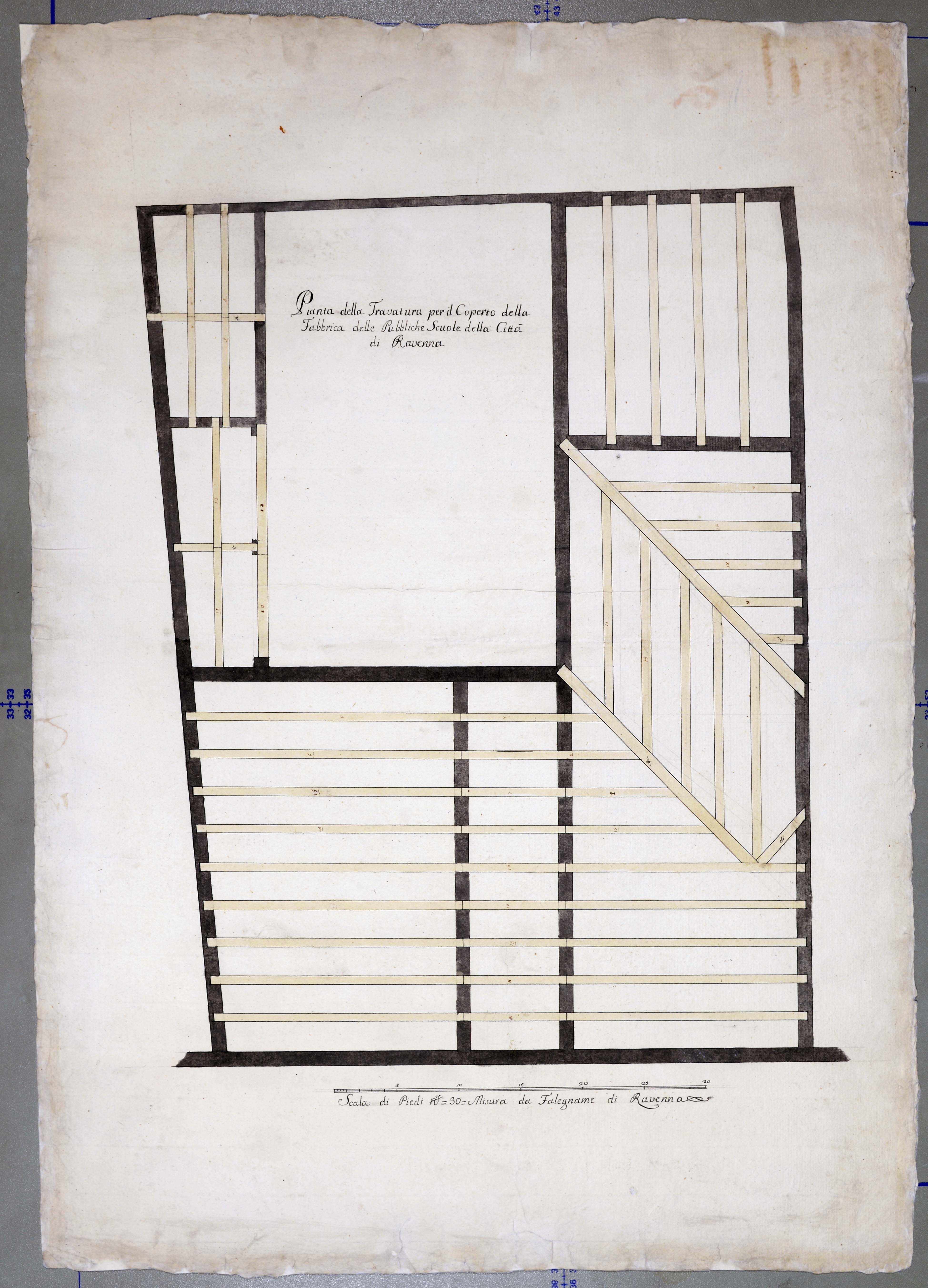 1. Pianta della casa di regione del comune di Ravenna, nella quale sono le pubbliche scuole, nella via Stuoie. 2. Pianta della travatura per il coperto della fabbrica come sopra.