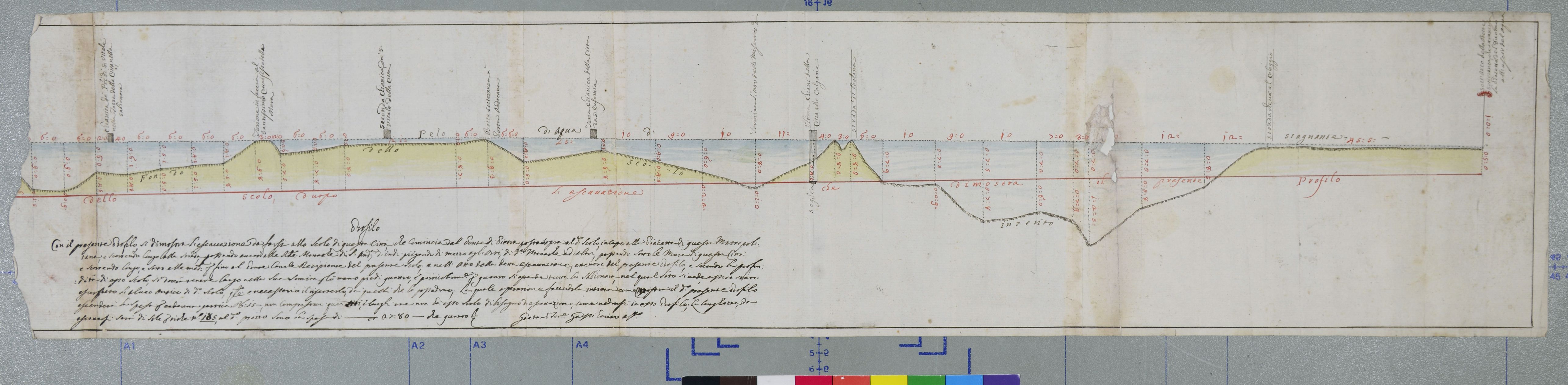 Profilo di escavazione da farsi allo scolo della città di Ravenna dal ponte di pietra posto sopra al detto scolo in capo alla Piazzetta del Duomo, scorrendo lungo la strada delle monache di Sant'Andrea fra gli orti passando sotto le mura e fino al ponte Canale.
