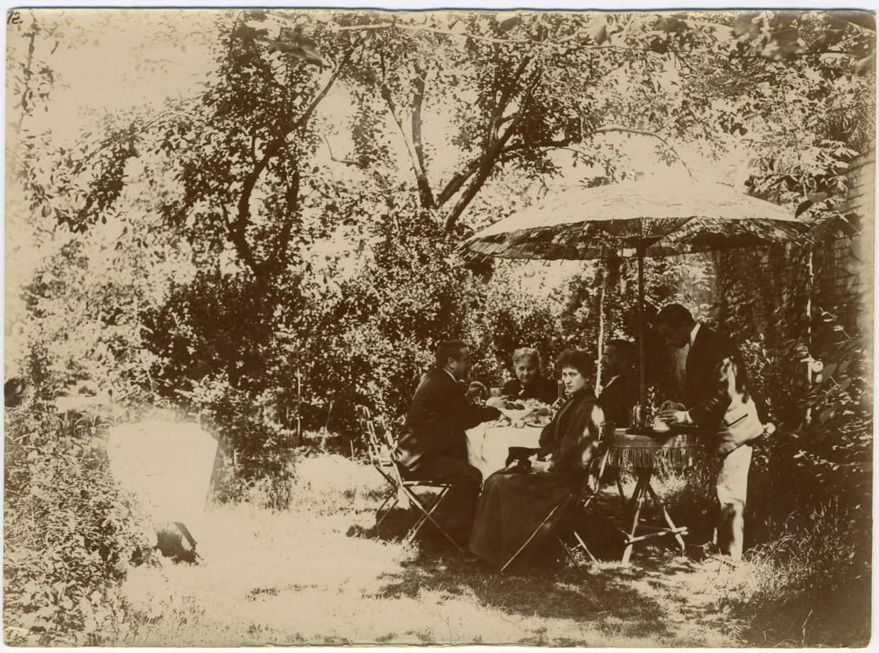 Famiglia Chiusoli in giardino attorno ad una tavola apparecchiata