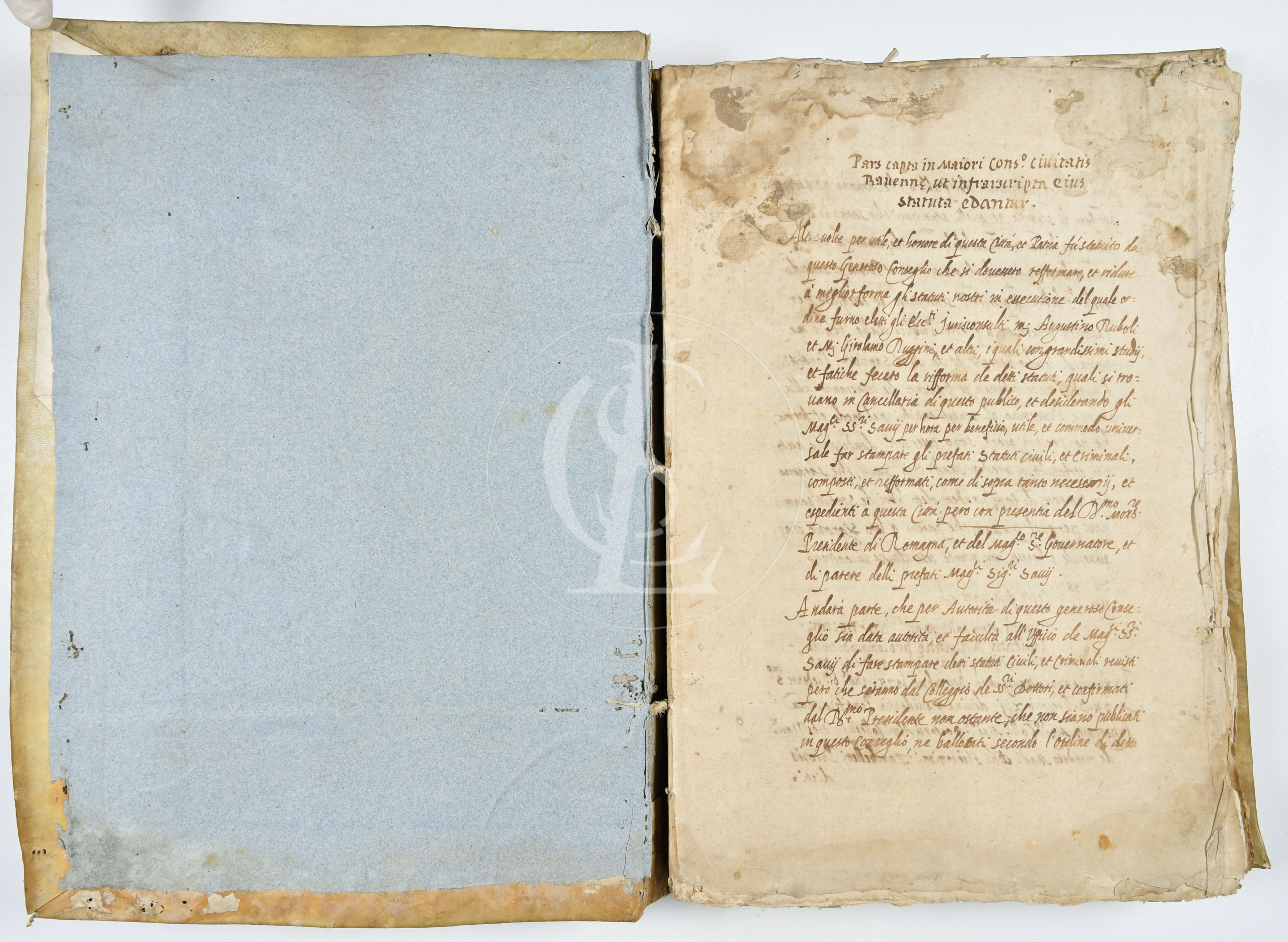 Le prime 6 carte contengono la trascrizione di due decisioni prese dal consiglio maggiore di Ravenna e iniziano con "Pars capta in Maiori con[sili]o civitatis Ravennae ut infrascripta eius statuta edantur"; a quesi testi segue una lettera di Girolamo Ruggini indirizzata a “Senatui, Populo[sque] Ravennae” alla quale segue l’indice delle rubriche.