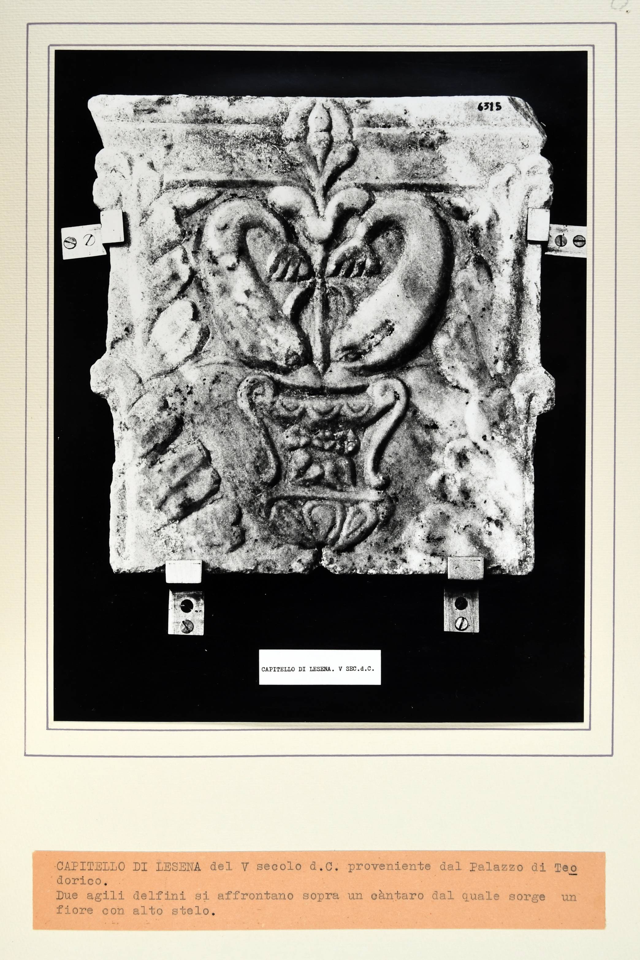 Titolo desunto da didascalia dattiloscritta: "CAPITELLO DI LESENA del V secolo d.C. proveniente dal Palazzo di Teodorico. Due agili delfini si affrontano sopra un cantaro dal quale sorge un fiore con alto stelo."