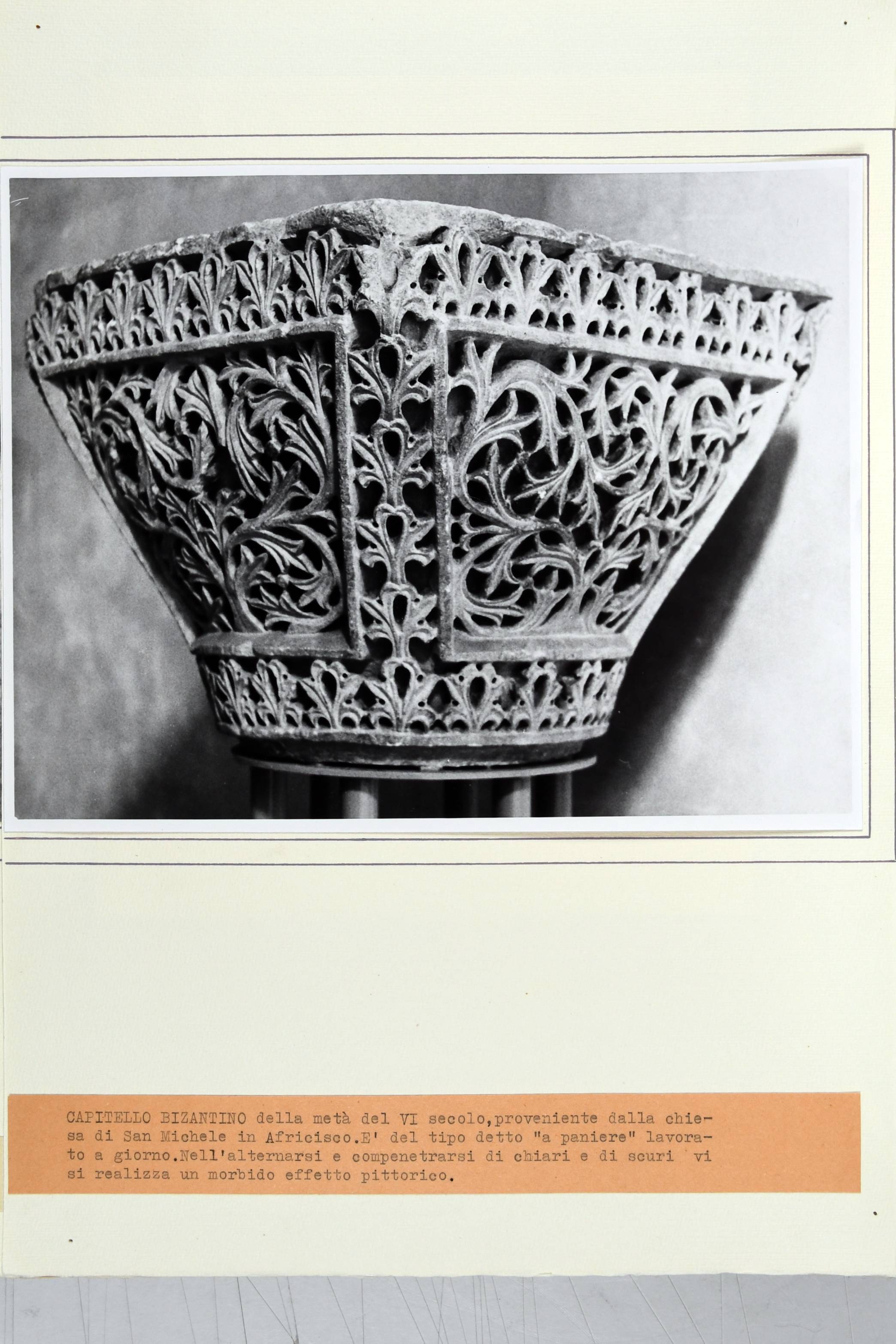 Titolo desunto da didascalia dattiloscritta: "CAPITELLO BIZANTINO della metà del VI secolo, proveniente dalla chiesa di San Michele in Africisco. E' del tipo detto "a paniere" lavorato a giorno. Nell'alternarsi e compenetrarsi di chiari e di scuri vi si realizza un morbido effetto pittorico."