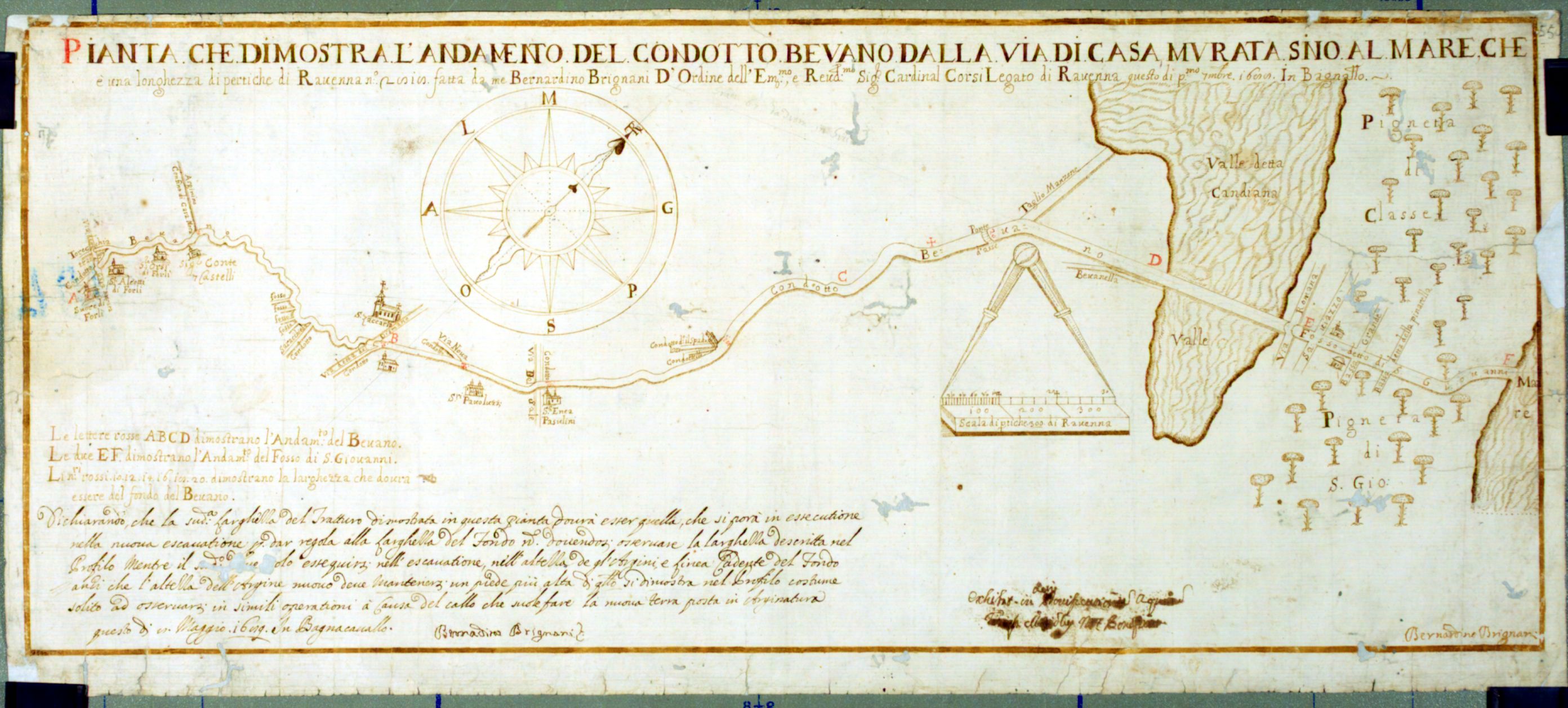 Pianta che dimostra l'andamento del condotto Bevano dalla Via di Casamurata fino al mare che � una lunghezza di pertiche di Ravenna n. 2818 fatta da Bernardino Brignani d'ordine del Card. Legato 1 Settembre 1688 in Bagnacavallo con una dichiarazione dello stesso perito in data 8 Maggio 1689