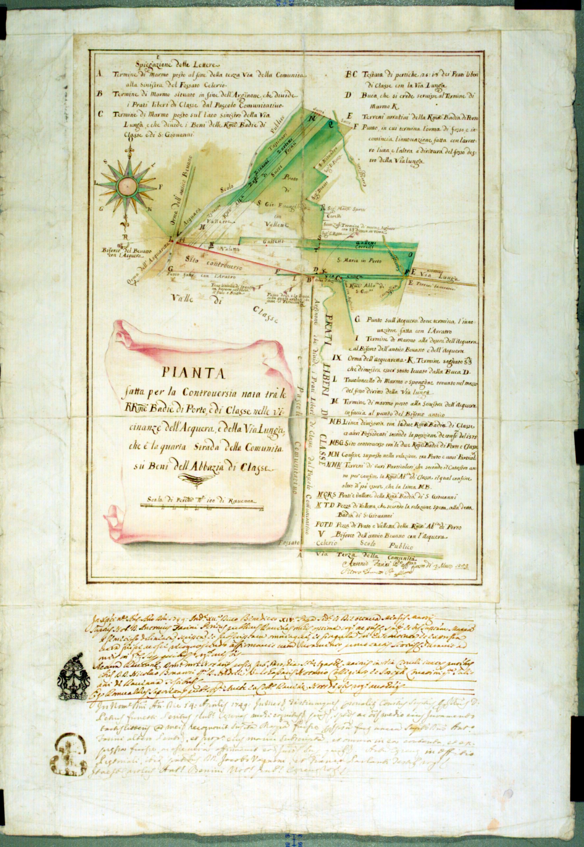 Pianta fatta per la controversia nata tra le RR. Badie di Porto e di Classe nelle vicinanze dell'Acquara e della Via Lunga che � la quarta strada della Comunit� su Beni dell'abbazia di Classe.