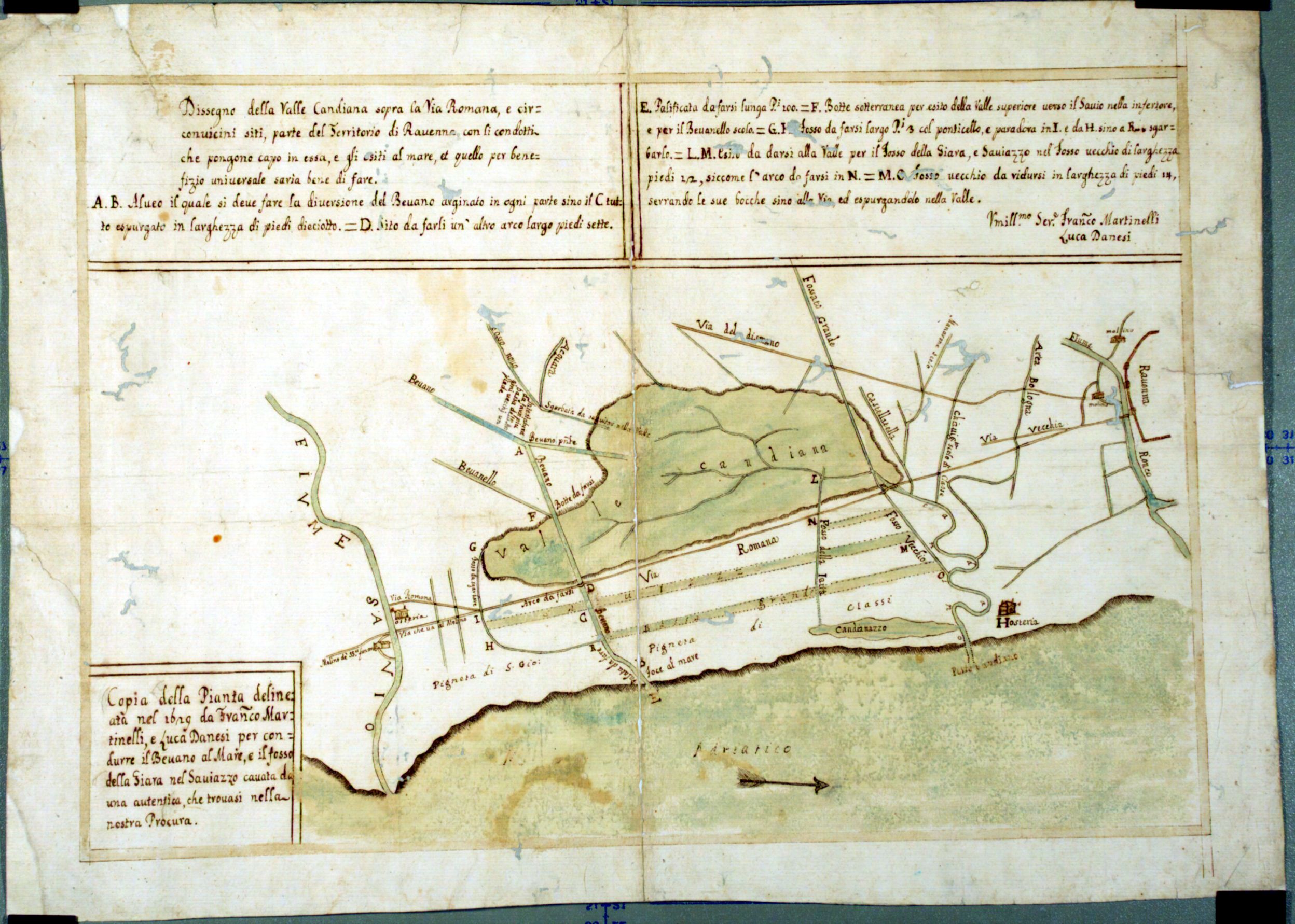 Valle Candiana. Copia della pianta delineata nel 1629 da Francesco Martinelli e da Luca Danesi per condurre il Bevano al mare e il Fosso della Giara nel Saviazzo cavata da una autentica che trovasi nella nostra Procura (di Classe)