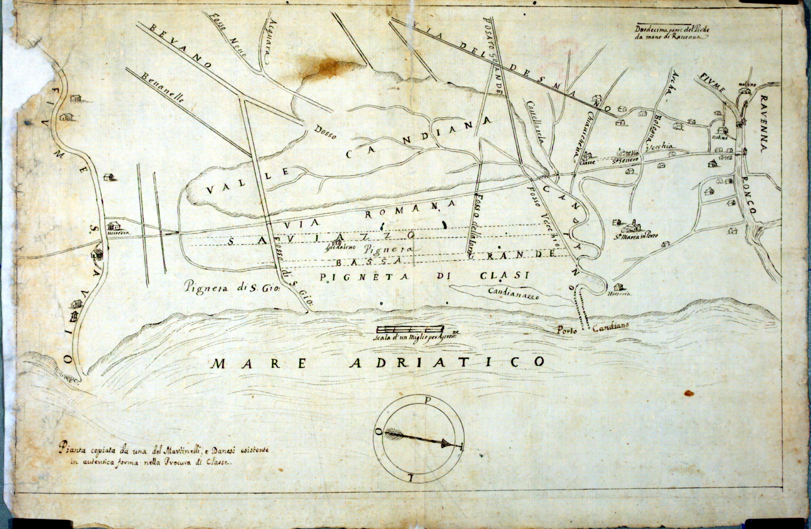 Valle Candiana. Copia della pianta delineata nel 1629 da Francesco Martinelli e da Luca Danesi per condurre il Bevano al mare e il Fosso della Giara nel Saviazzo cavata da una autentica che trovasi nella nostra Procura (di Classe)