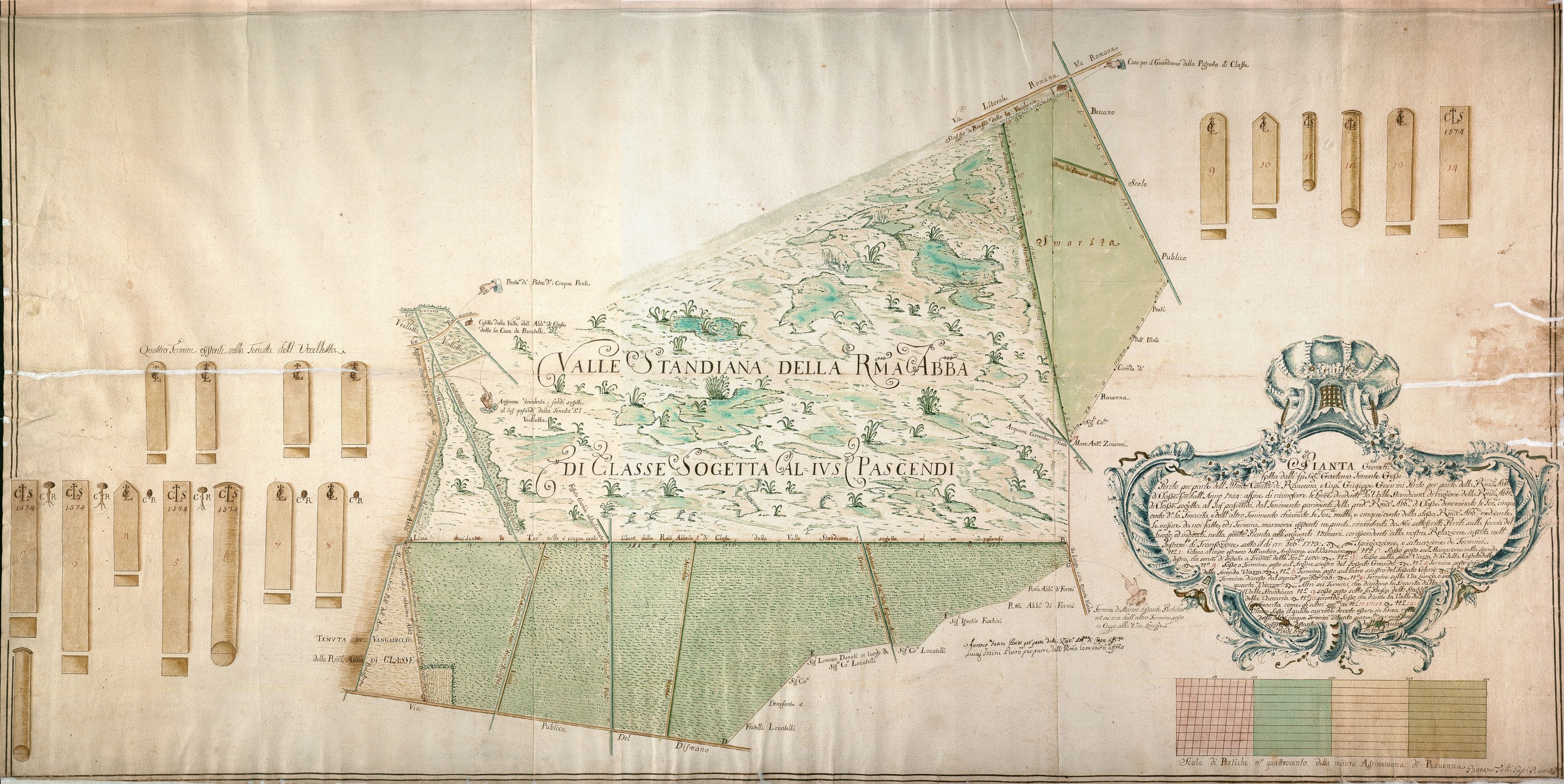Pianta della Valle Standiana di regione dell'Abbazia di Classe soggetta al ius pascendi dal tenimento detto le Tornature 500 o la Smarrita e dall'altro tenimento detto le tornature 1500 dell'abbazia di Classe e apposizione dei confini.