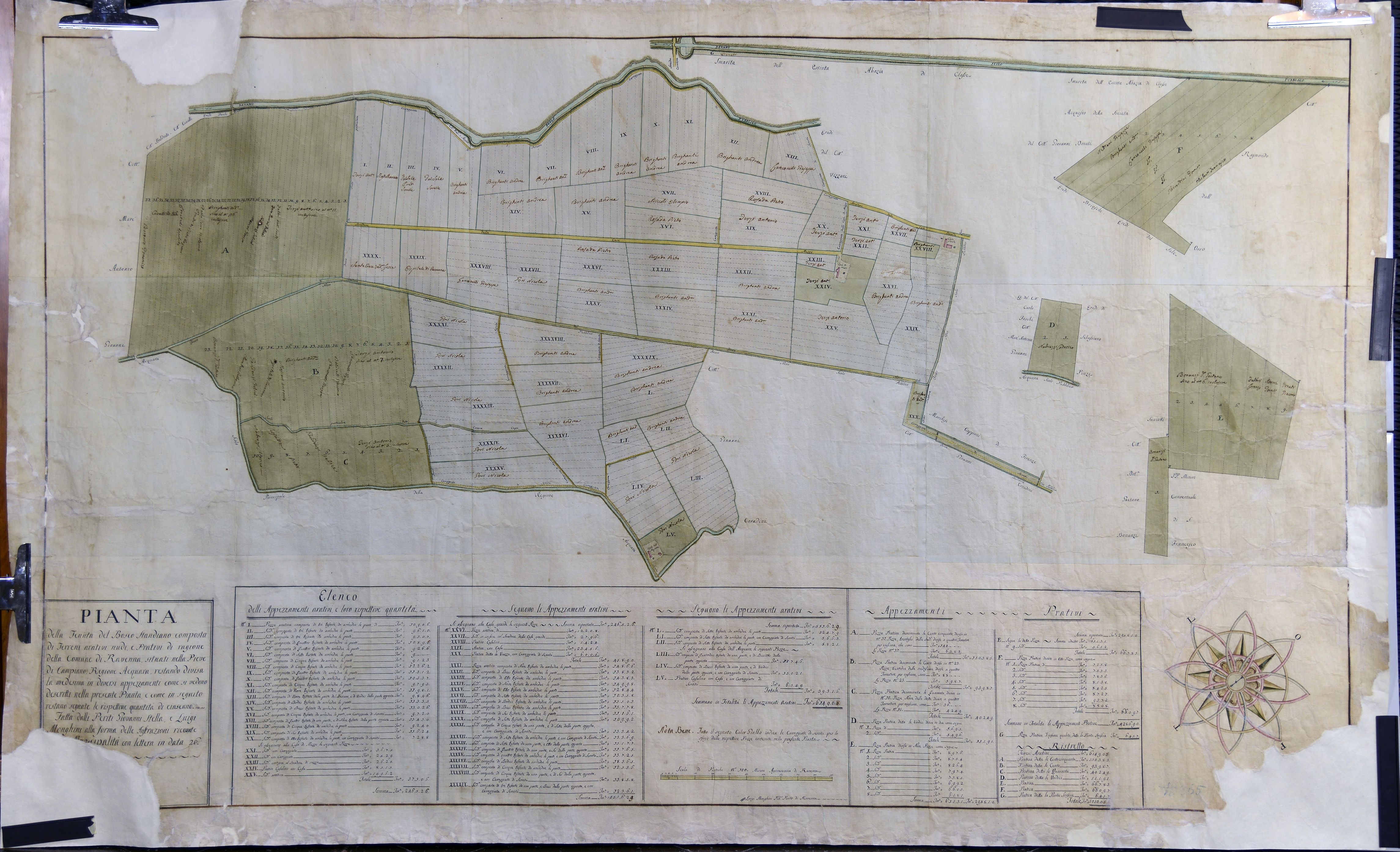 Pianta della tenuta del bosco Standiano composta di terreni arativi nudi e Prativi di regione della Comune di Ravenna situati nella pieve di Campiano, Regione Acquara, restando divisa la medesima in diversi appezzamenti come si vedono descritti nella presente pianta e come seguito restano segnate le rispettive quantità di ciascuno. Fatta dalli periti Giovanni Stella e Luigi Monghini alla forma delle istruzioni ricevute dalla municipalità con lettera in data 26 [1812]