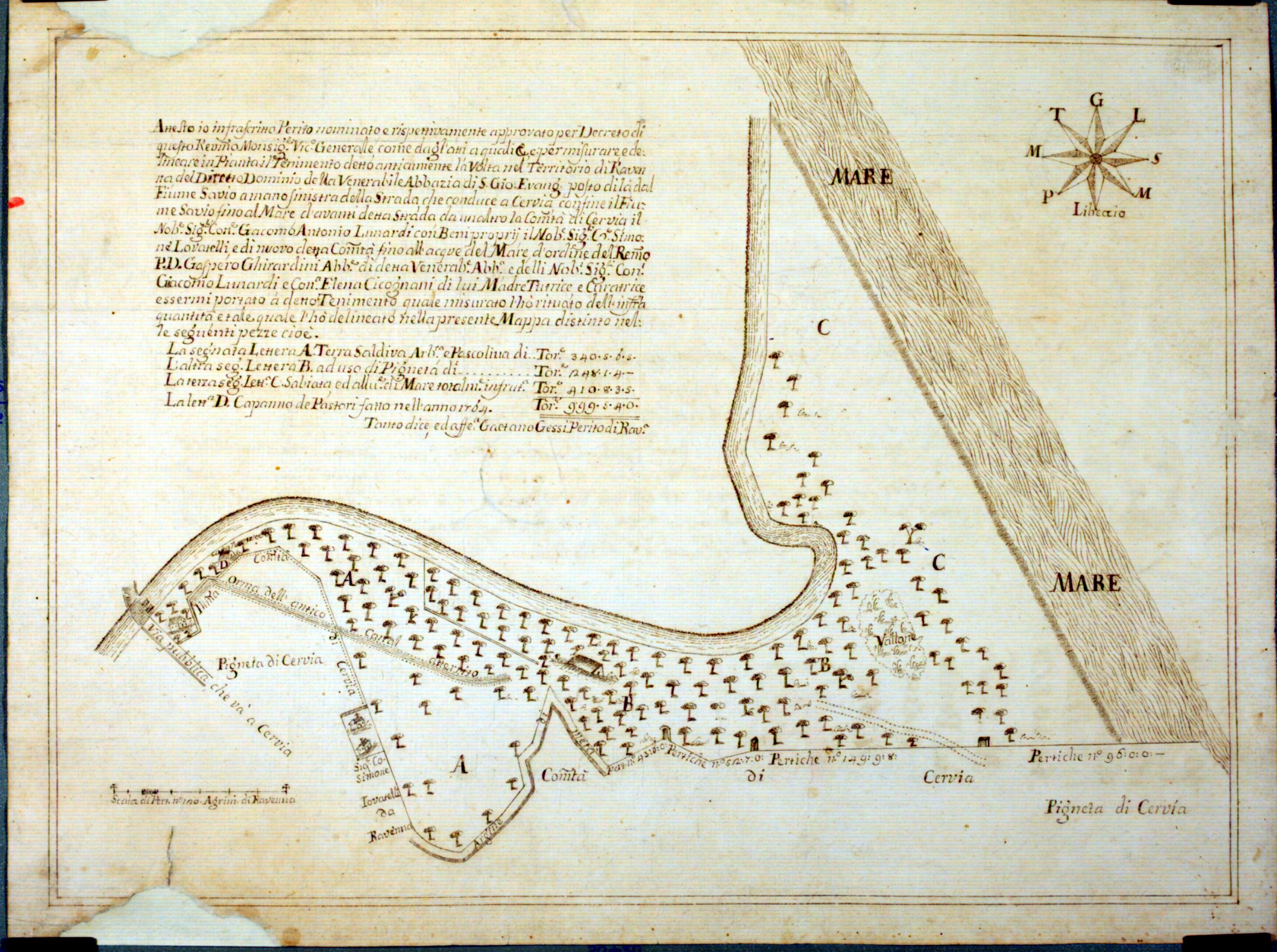 Pianta che dimostra il corso del fiume Savio presso i beni dell'abbazia di Classe e altri beni delle monache di S. Lucia di Venezia nel territorio di Cervia.