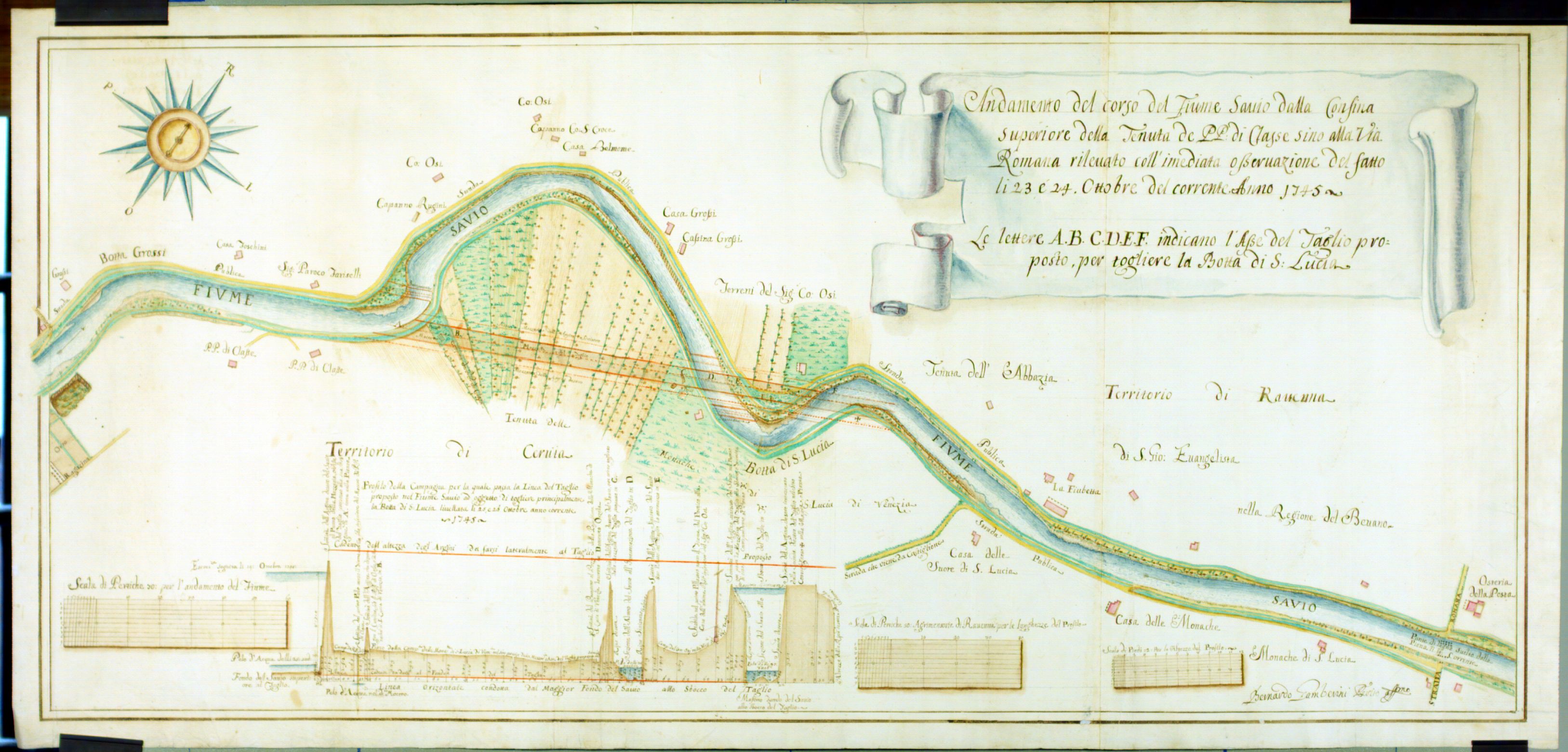 Andamento del corso del fiume Savio dalla Ragazzena confine superiore della tenuta de' PP. di Classe fino alla via Romana.