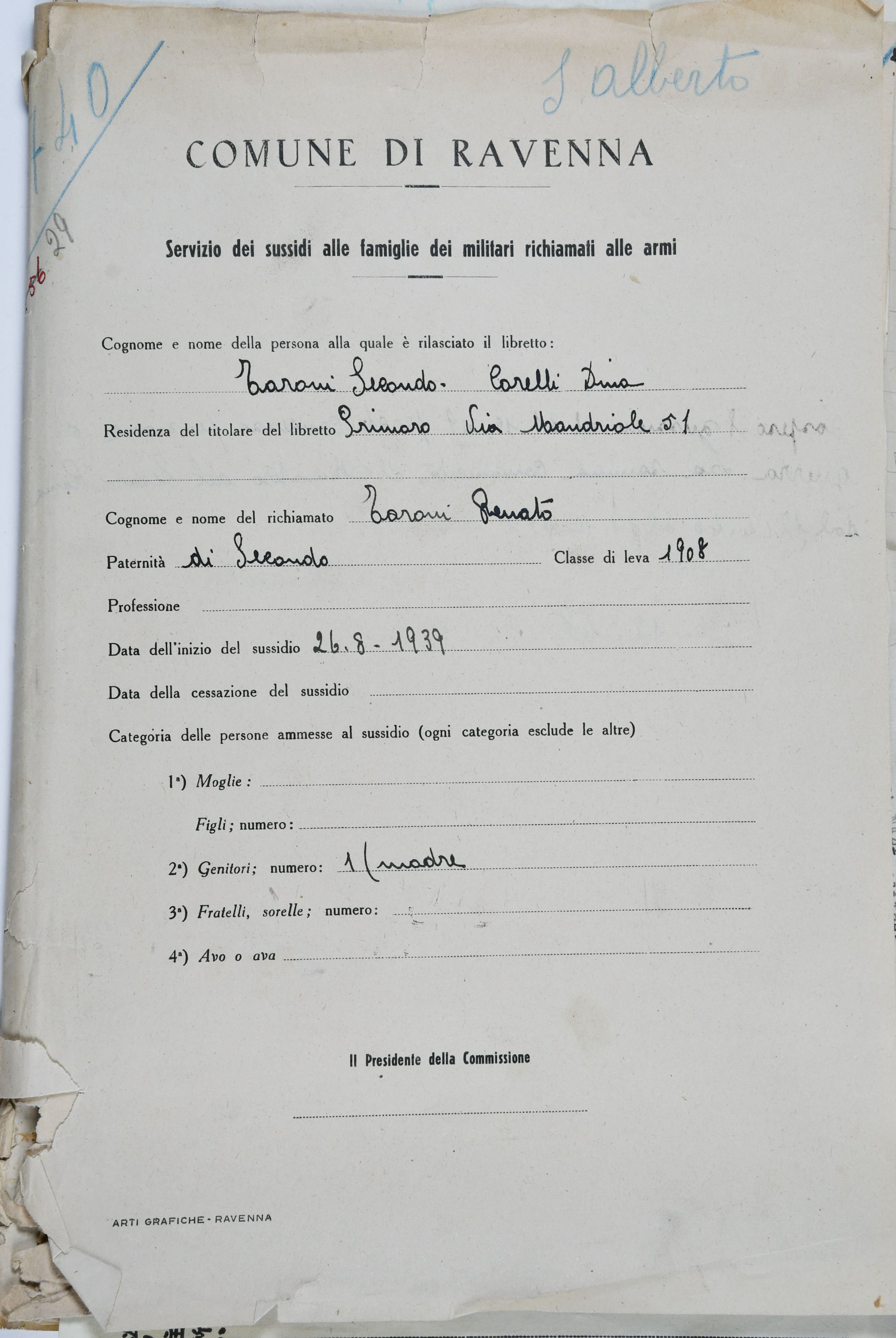 Secondo, padre di Paolo e Renato fa richiesta di sussidio militare che gli fu tolto l’8 settembre 1943 “causa lo svolto della nazione”. Nella lettera Secondo informa il Sindaco che il figlio Renato è prigioniero in America e il figlio Paolo è tornato da poco dalla prigionia in Tunisia ed è ricoverato all’ospedale Rizzoli di Bologna poiché ha subito l’amputazione della gamba sinistra.