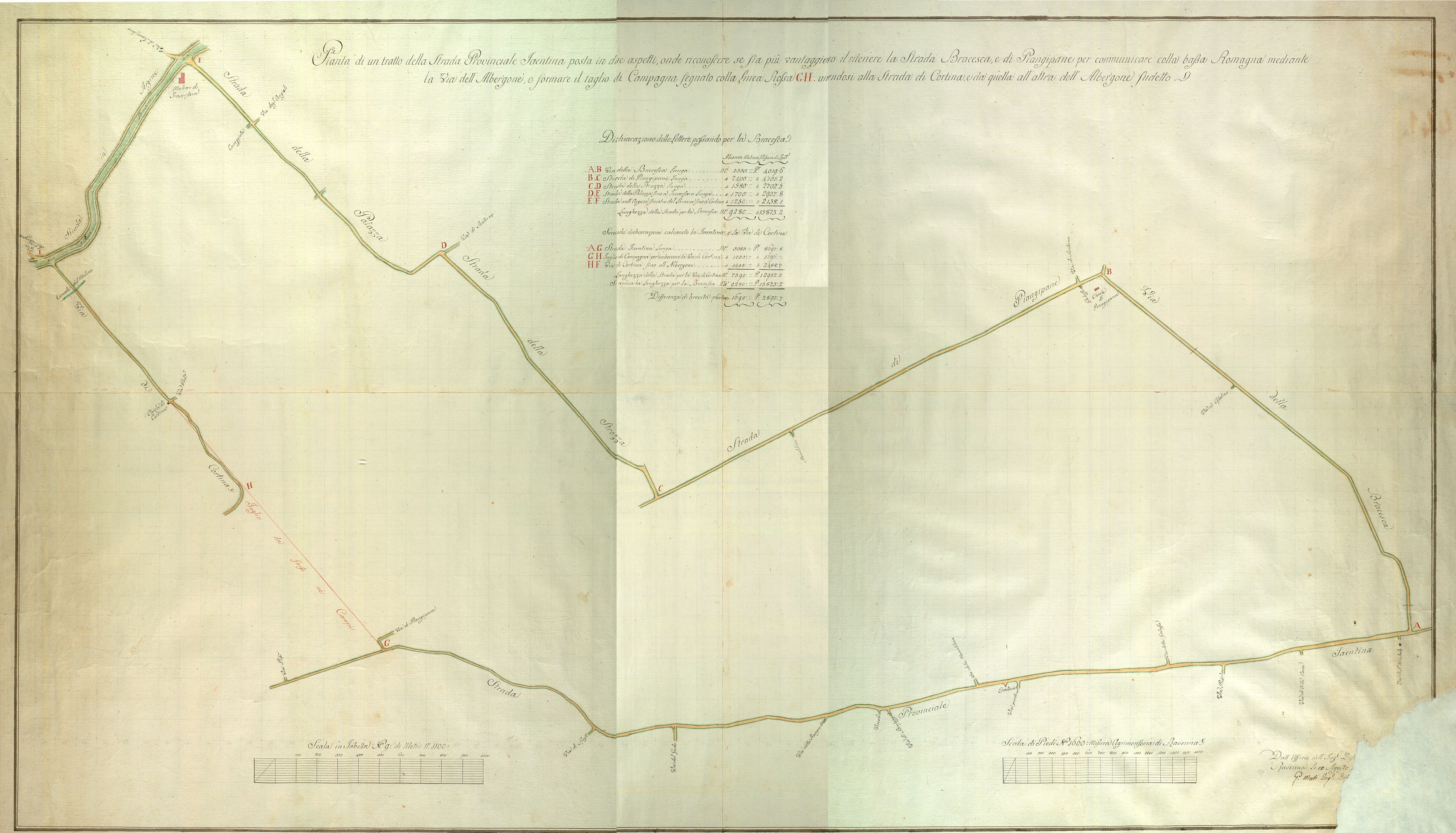 Pianta di un tratto della strada provinciale Faentina posta in due aspetti onde riconoscere se sia più vantaggioso il ritenere la strada Braccesca di Piangipane per comunicare con la bassa Romagna mediante la via dell'Albergone o formare il taglio di campagna della via di Piangipane alla via di Cortina e da quella all'altra dell'Albergone;