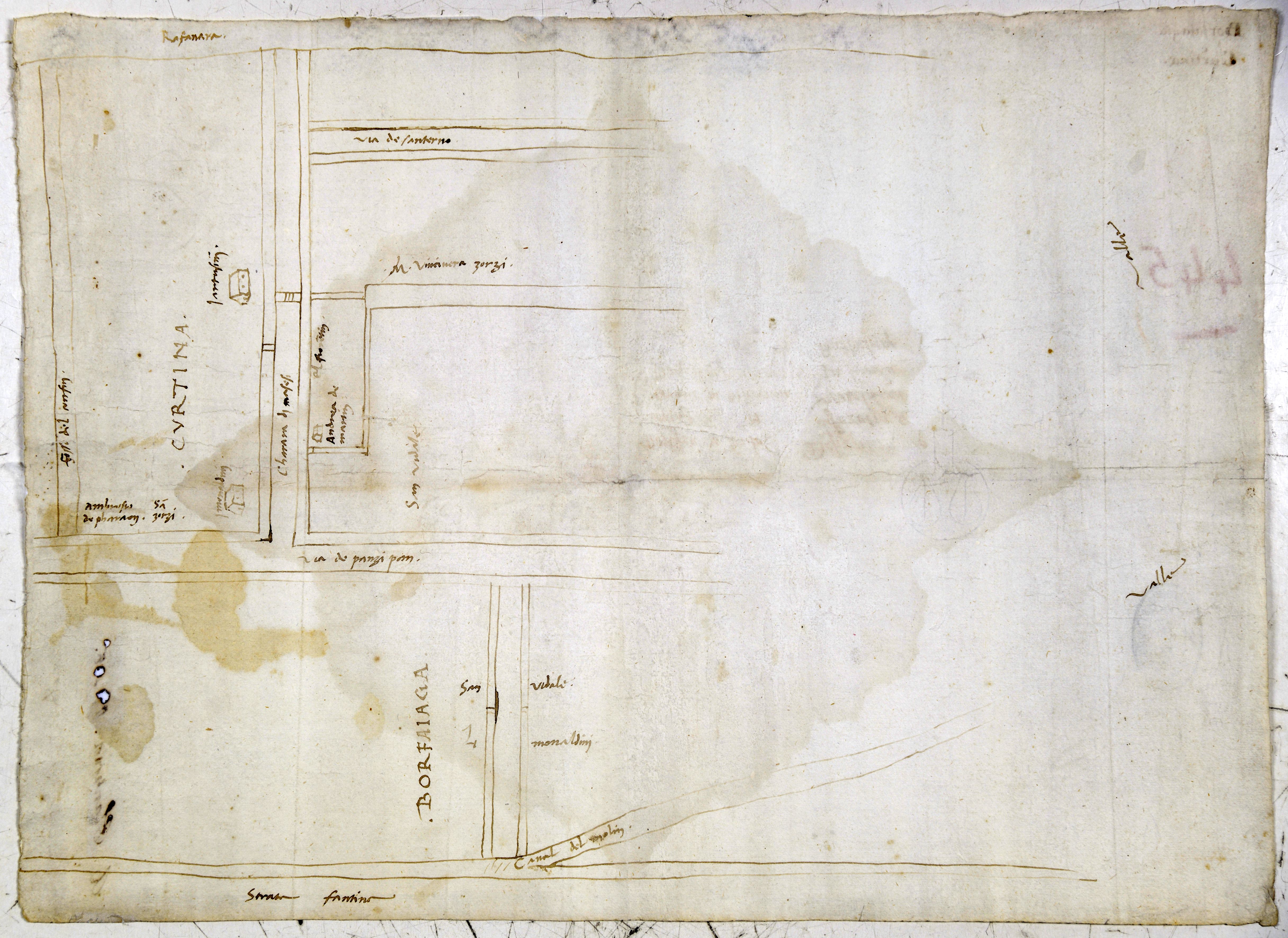 (Cortina, Borfaiaga, Rafanara, Via di Piangipane, Strada Fantina, Canale del molino) Per una lite coi Monaldini su di un fondo in Borfagliaga.