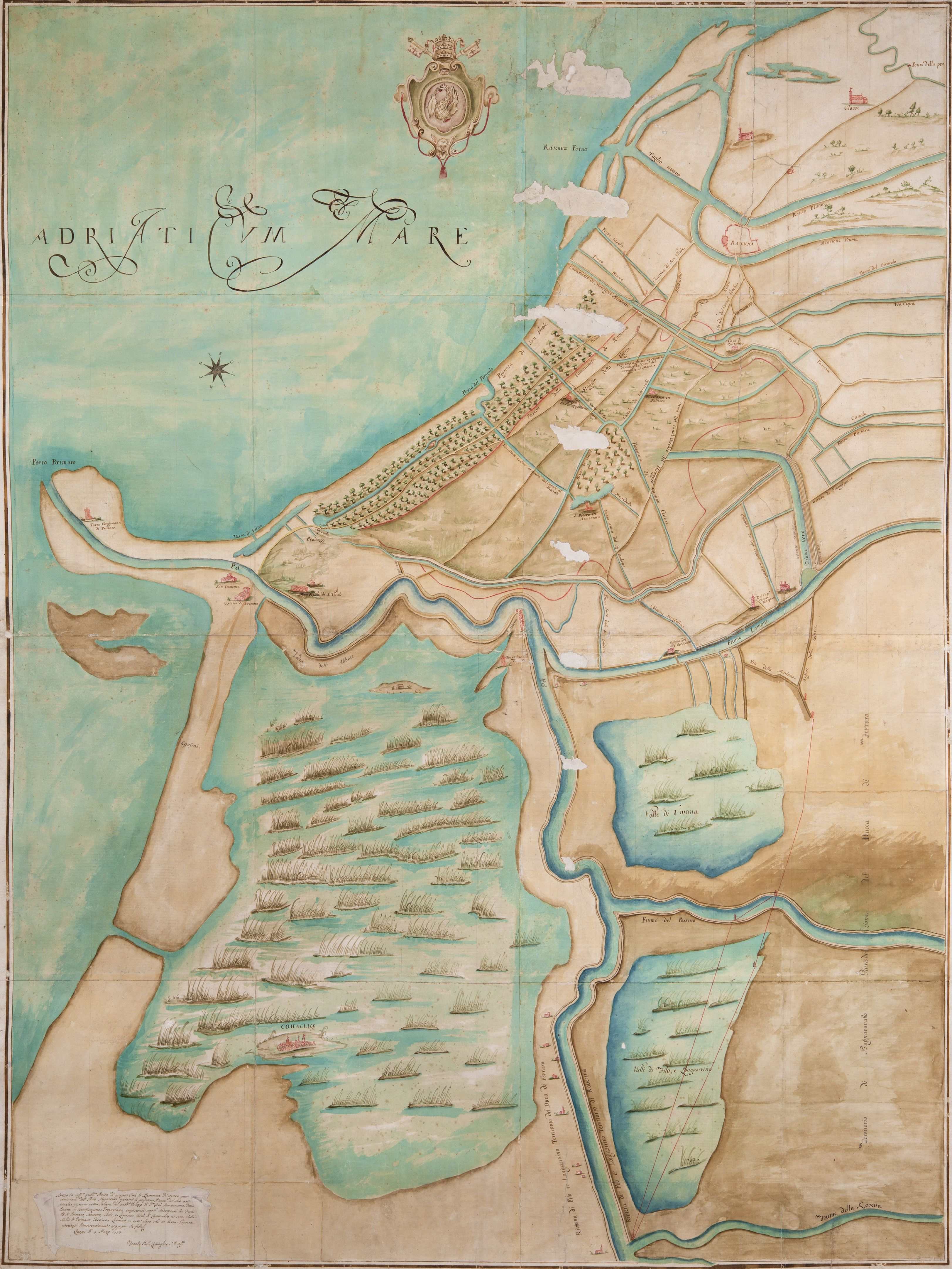 Bonificazione gregoriana, copiata da un originale esistente in Comune da Francesco Paolo Zellingher il 4 marzo 1774 (Ravenna tra i fiumi. Ponte della pietra. S. Apollinare in Classe, S. Maria in Porto, Bocca del Porto, pineta, marem S. Pietro in Armentariom Lamonem Molino Rasponi, Marianne, Valle d'Umana, S. Alberto, Mandriole, Primaro, Testa d'asino, Valli di Filo e Longastrino. Valli di Comacchio).
