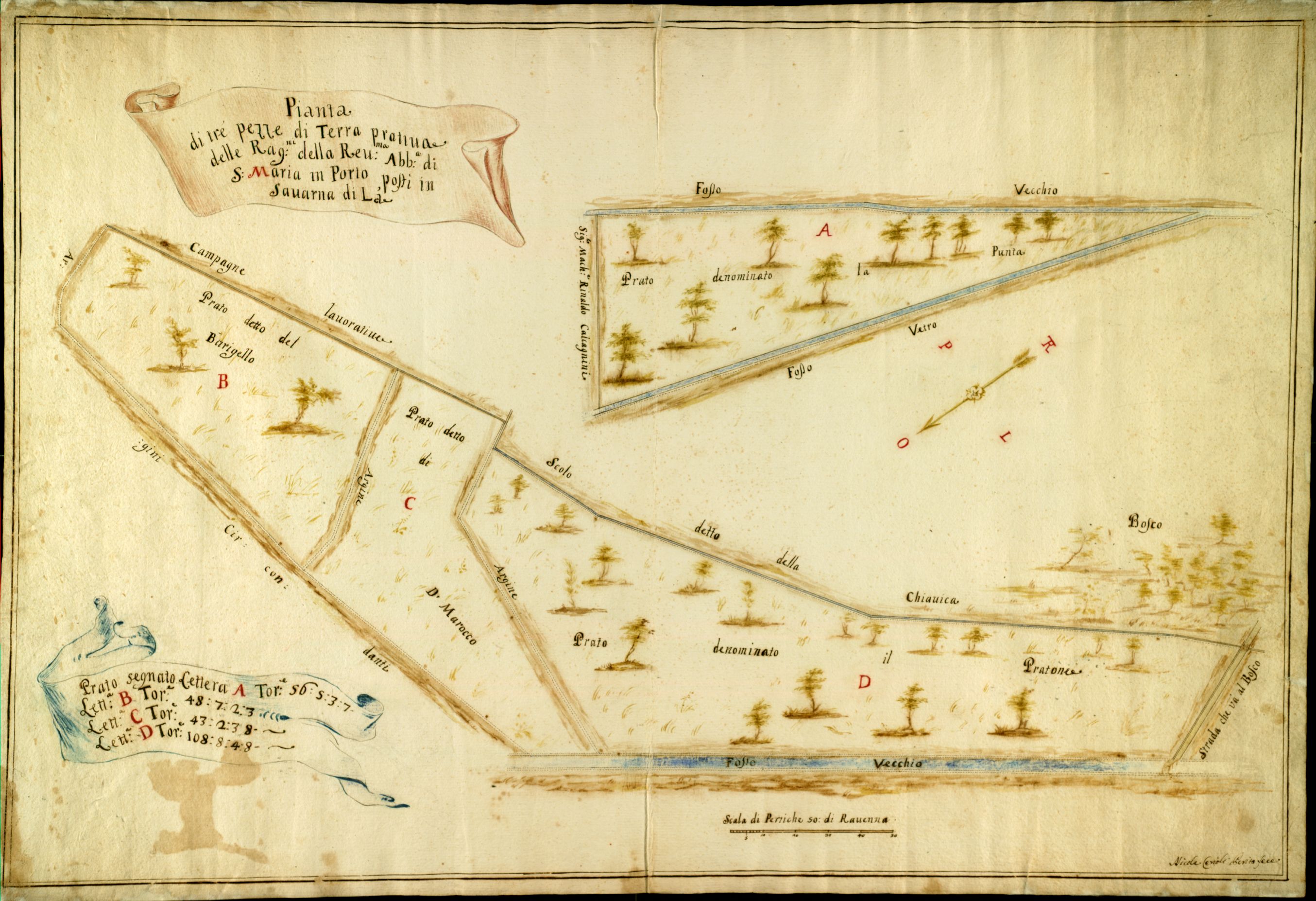 Pianta di tre pezze di terra prativa di regione della Rev. abbazia di S. Maria a Porto poste in Savarna di là.