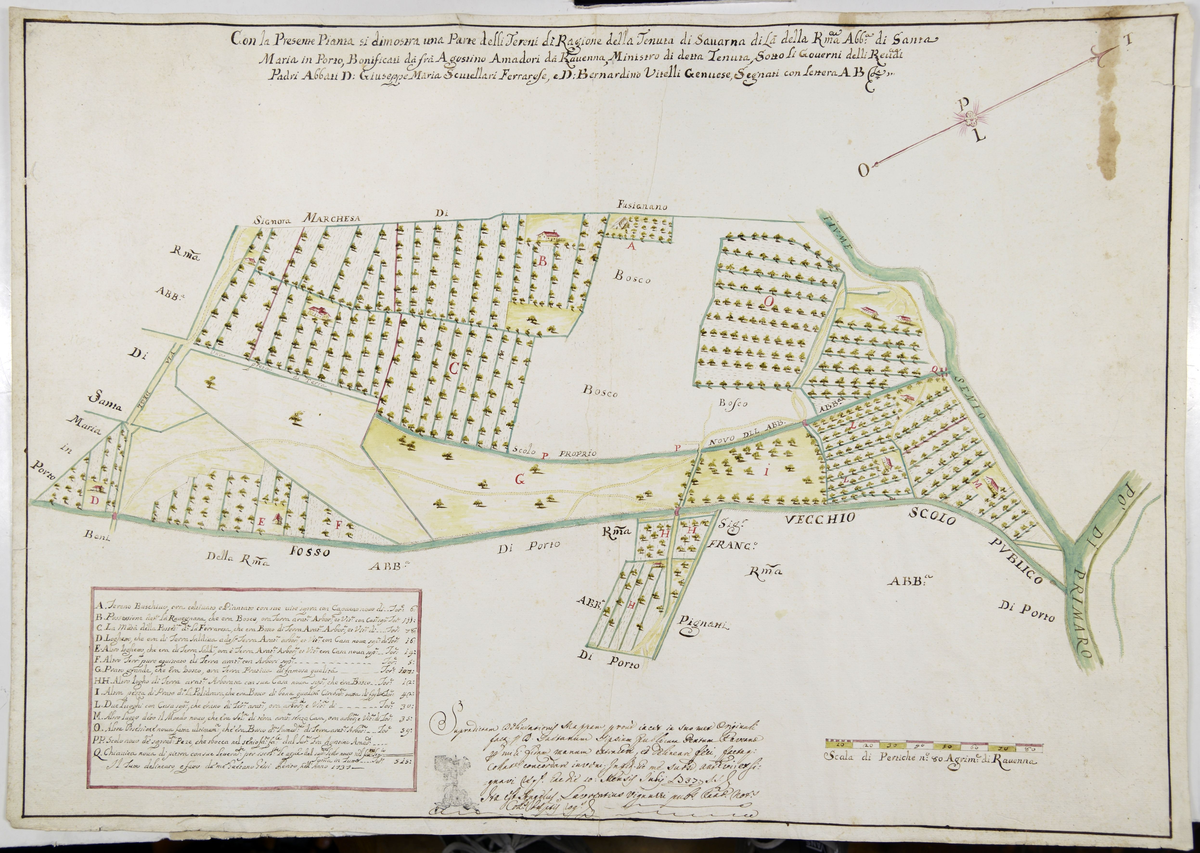 Pianta di una parte delli terreni di ragione della Tenuta di Savarna di là dalla Rev. Abbazia di S. Maria in Porto bonificati da fra Agostino Amadori da Ravenna ministro della Tenuta sotto li governi dei PP. abati D. Giuseppe Maria Scutellari ferrarese e d. Bernardino Vitelli genovese.