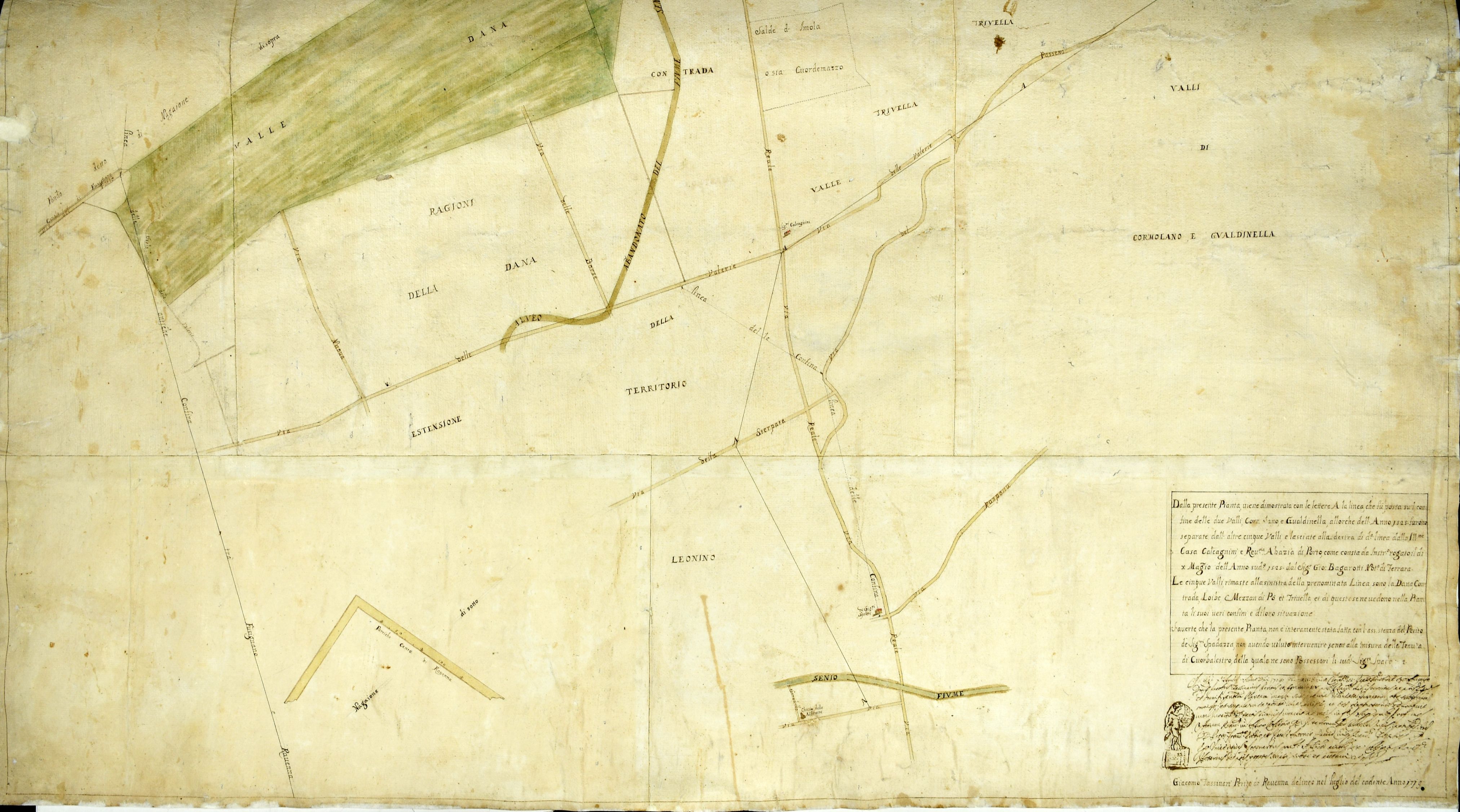 Pianta che dimostra i confini posti nel 1525 nelle valli Cormalano e Gualdinella per separare dalle altre cinque valli Dana, Contrada, Loibe, Mezzan di Po e Trivella.