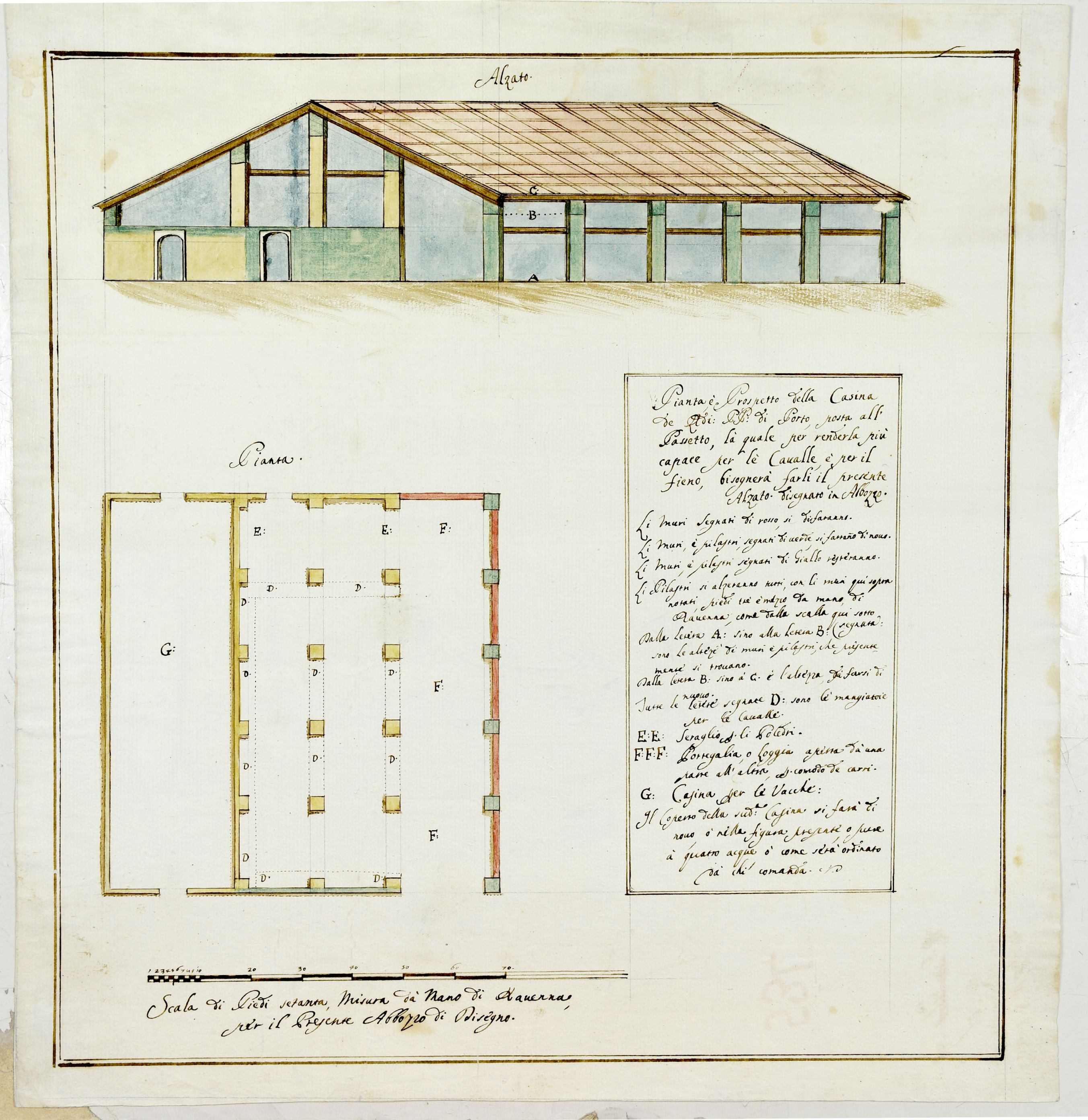 Pianta e prospetto della Casina de' PP. di Porto posta al Passetto; progetto di ampliamento per ricoverare le cavalle.