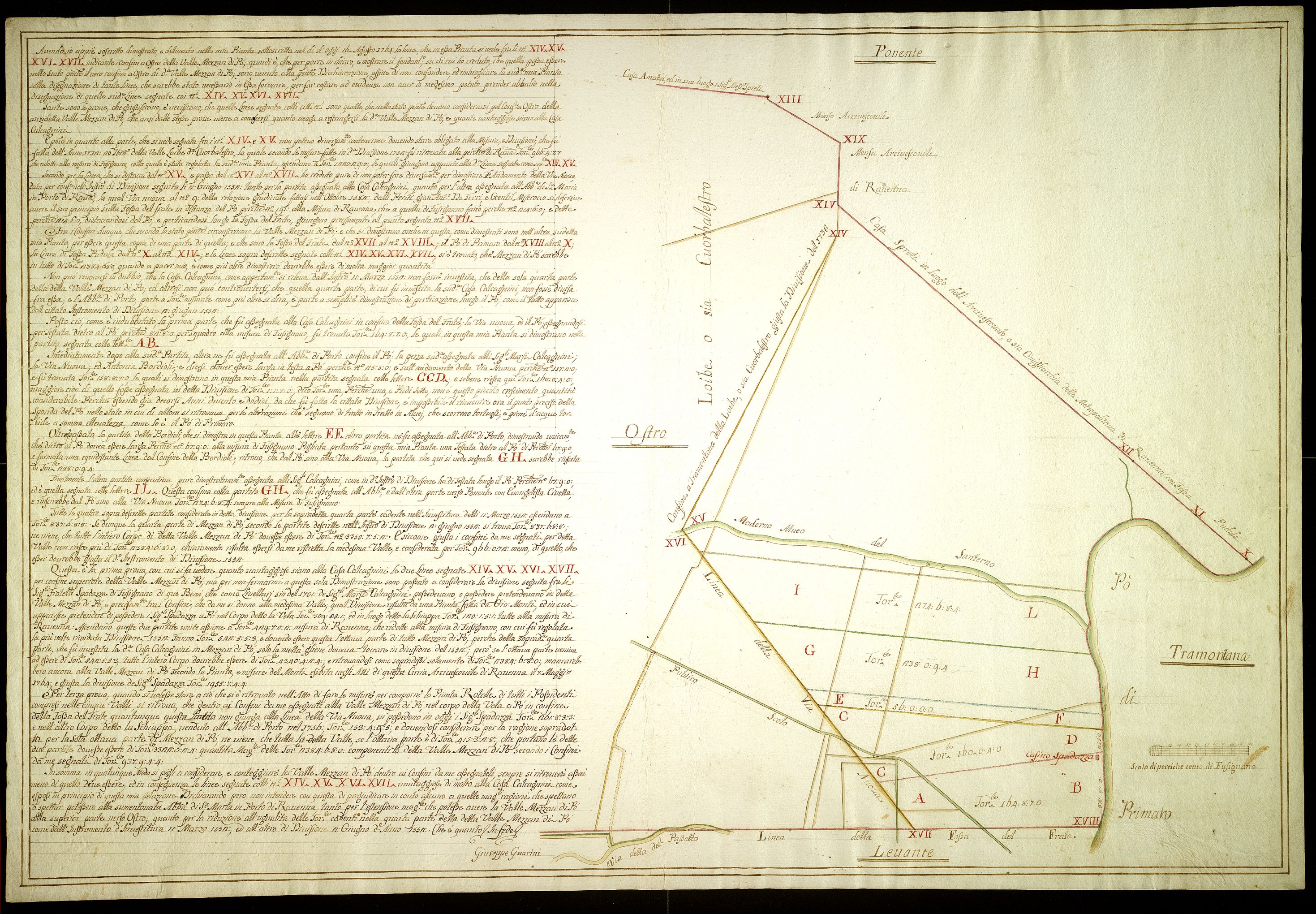 Pianta dei confini della valle Mezzan di Po data in enfiteusi dall'abazia di Porto ai Calcagnini.