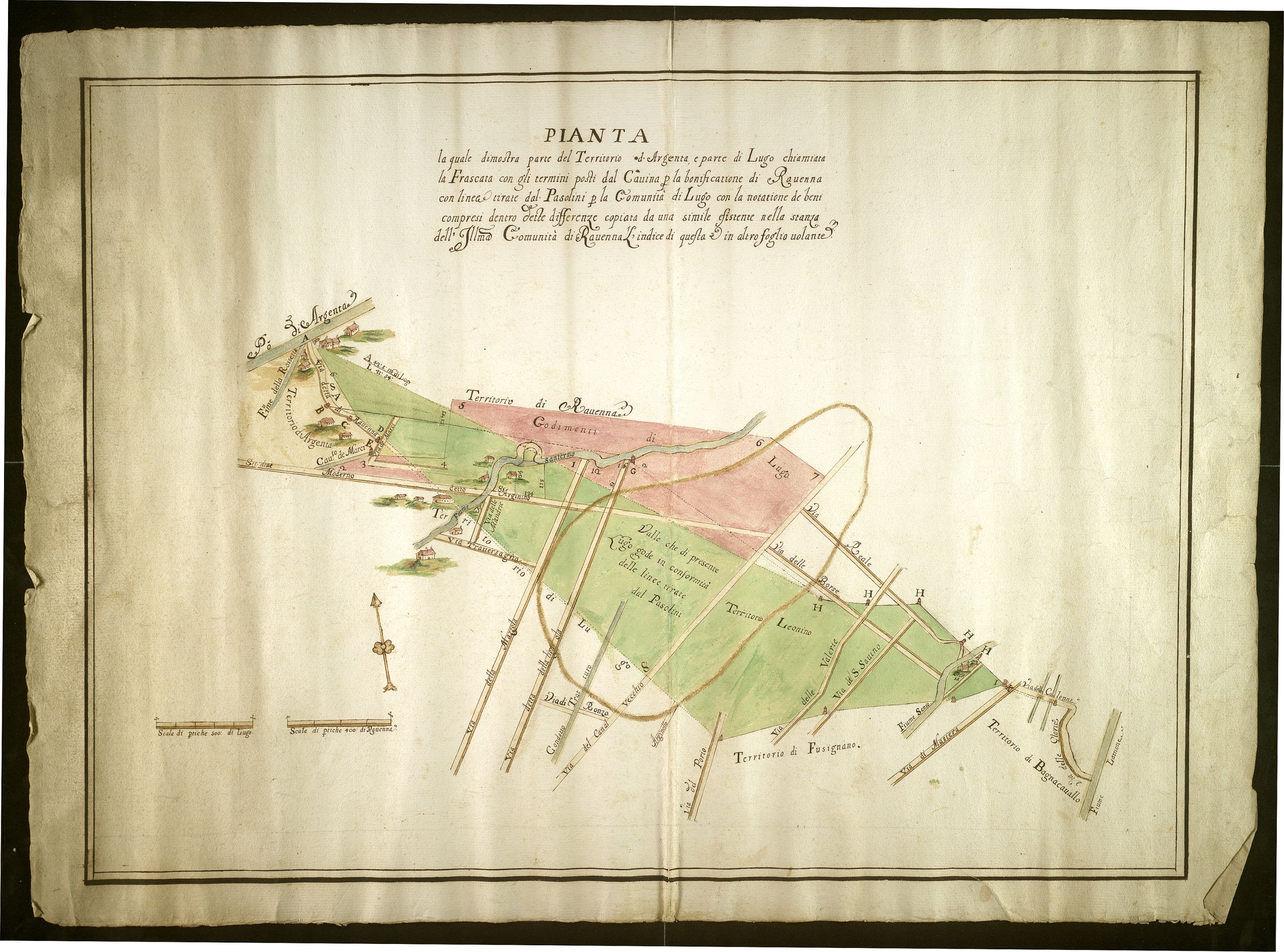 Pianta di parte del territorio d'Argenta e parte di Lugo detta la Frascata coi domini posti dal Cavina per la bonificazione di Ravenna con le linee tirate dal Pasolini per la Comunità di Lugo