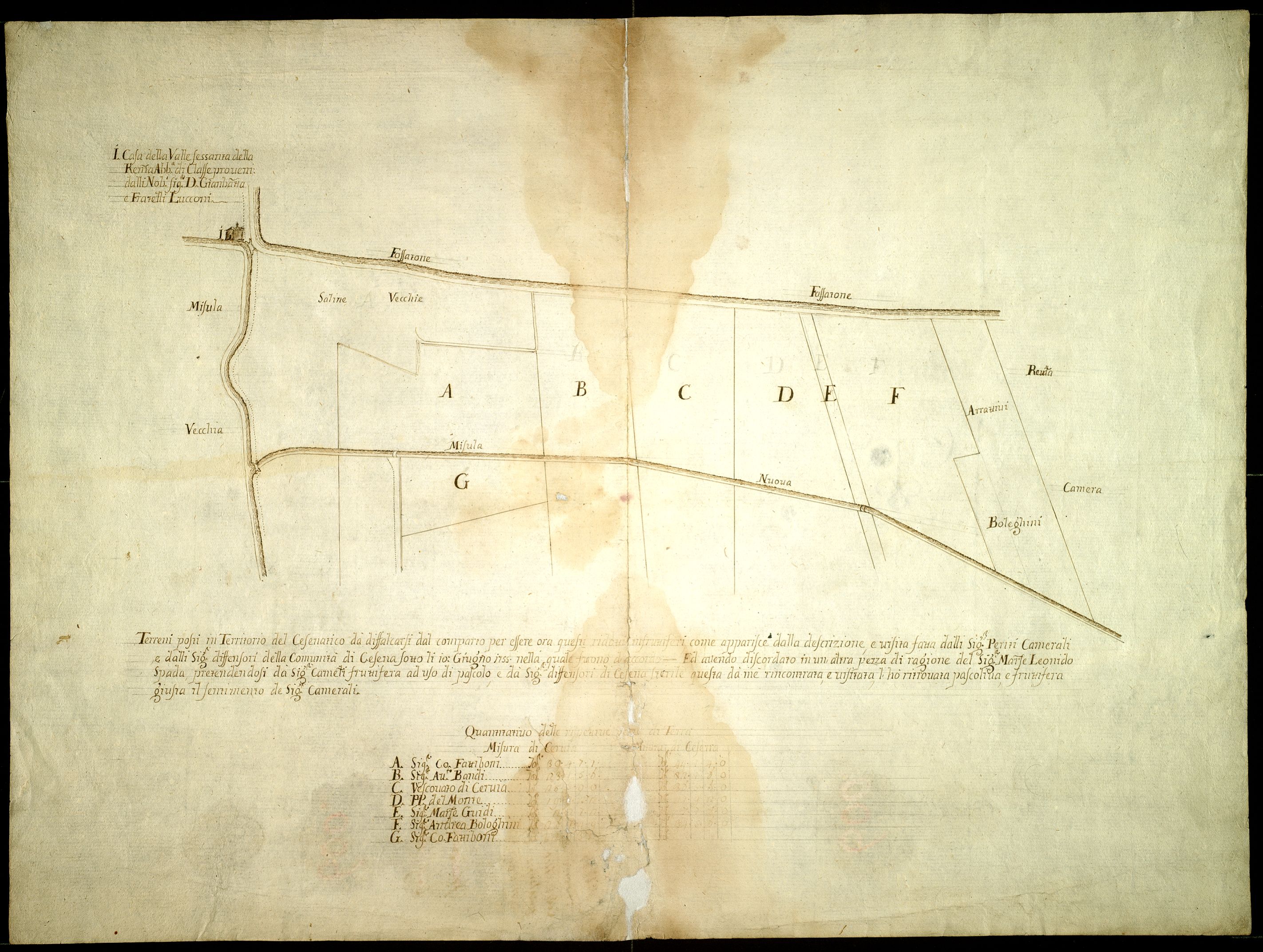 Terreni posti tra la Misula nuova, la Misula vecchia e il Fossatone nel Cesenatico, in questione tra l'abbazia di Classe e il Comune di Cesena per i pascoli.