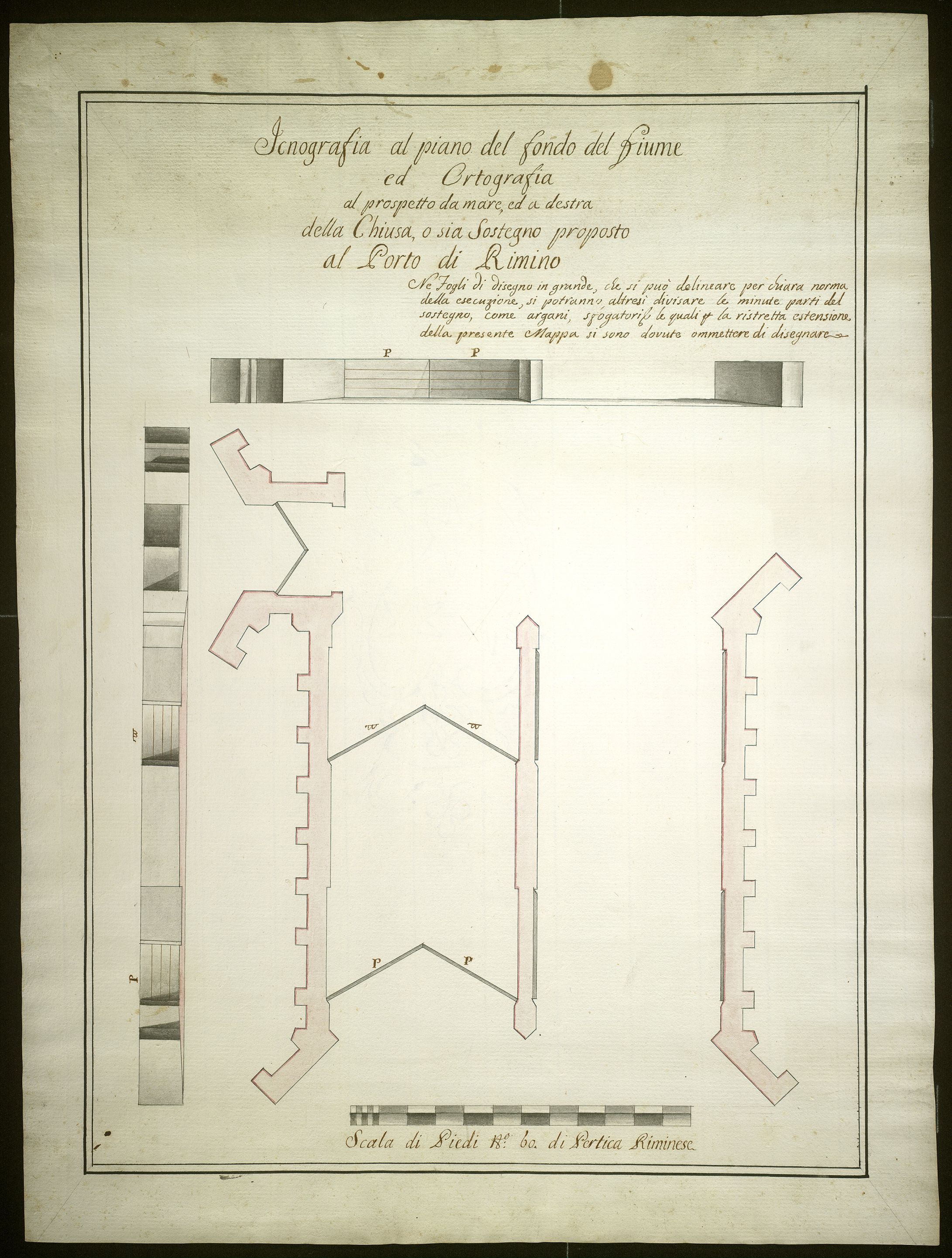 Iconografia al piano del fondo del fiume ed ortografia al prospetto da mare ed a destra della chiusa ossia sostegno proposto al Porto di Rimino.