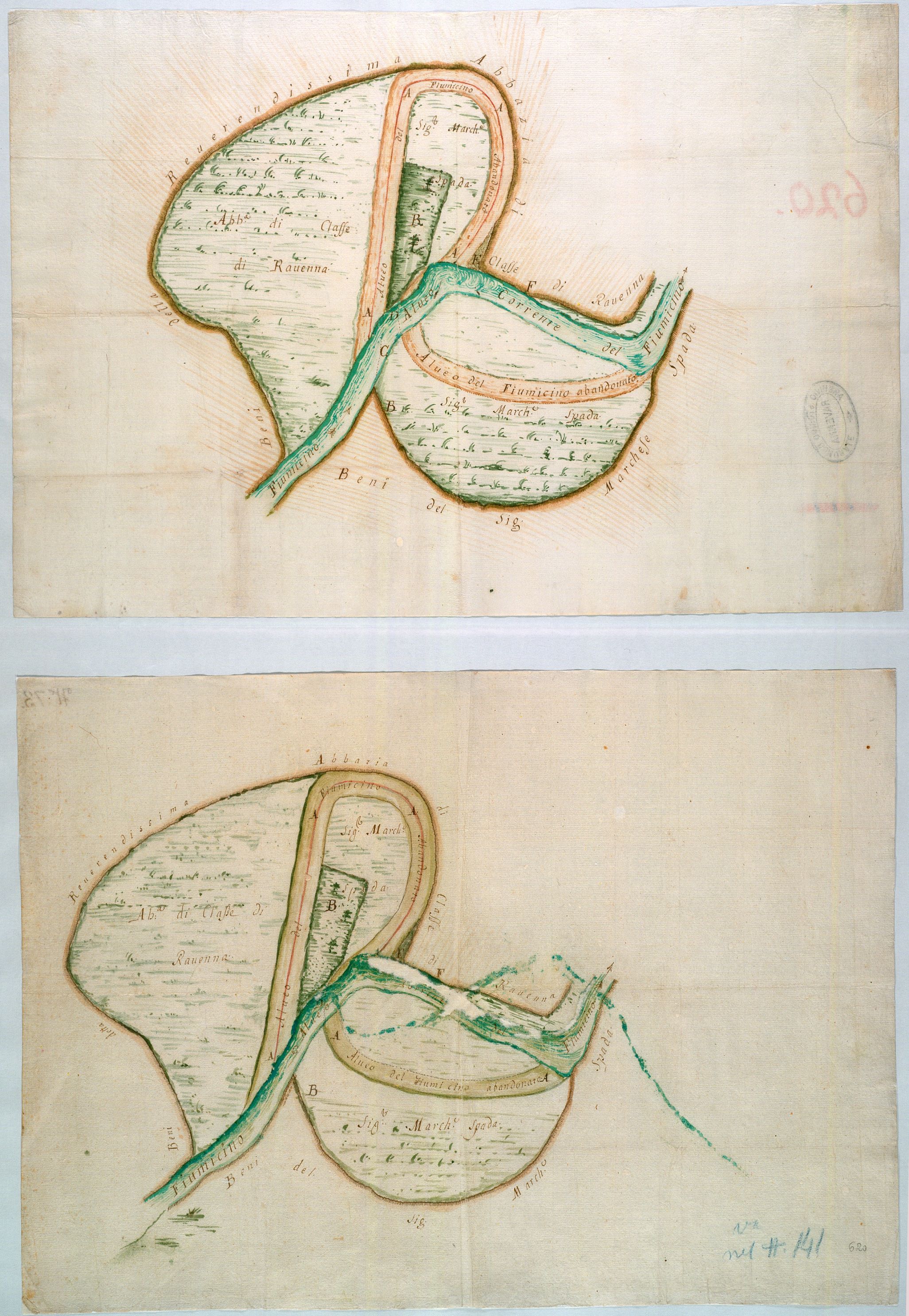 (Beni dell'abbazia di Classe, beni del marchese Spada, Fiumicino corrente e Fiumicino abbandonato) e un foglio con la relazione più beni Spada.