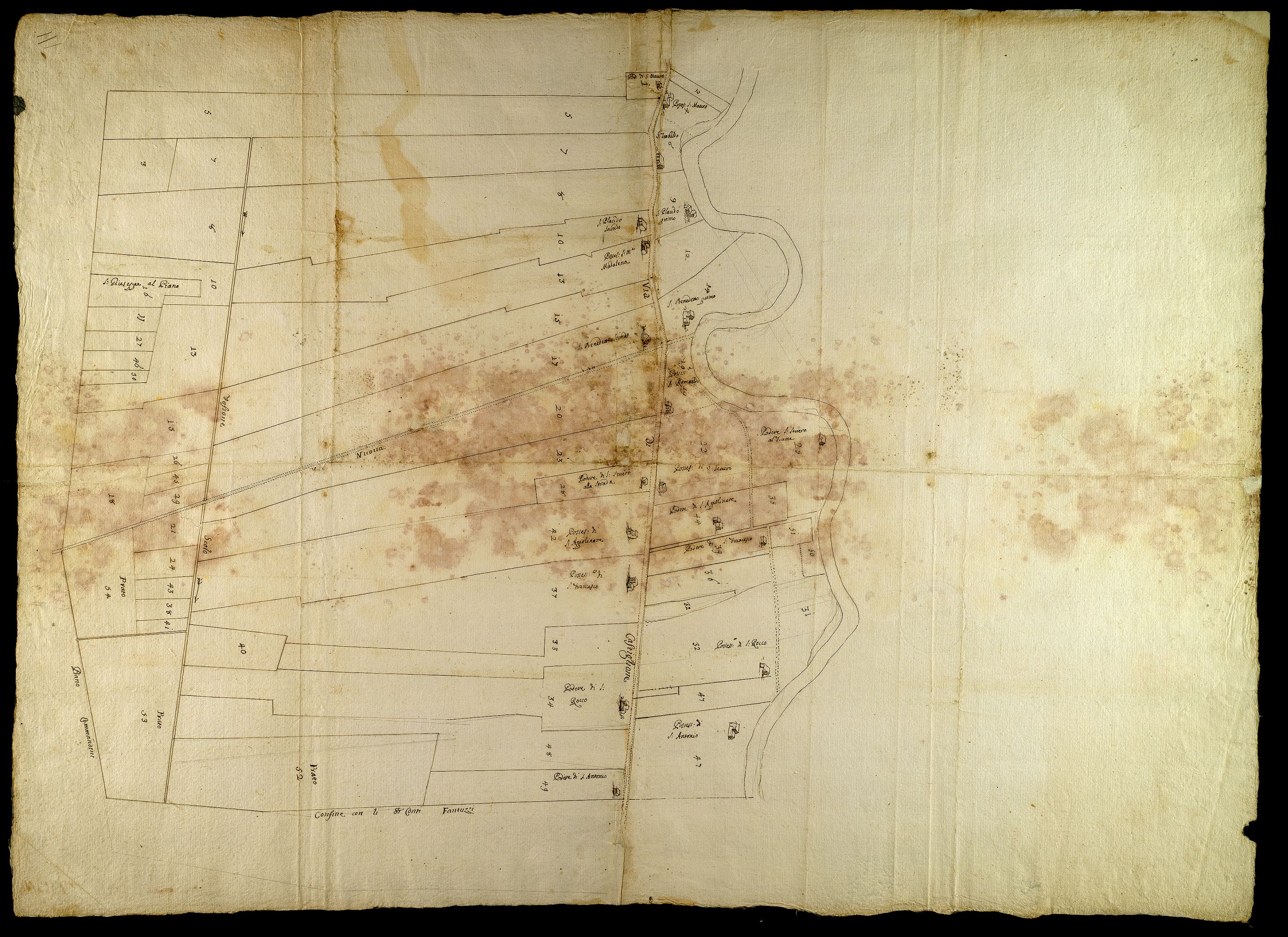 Mappa di possessioni presso il Savio del confine Piano Comandini di là dal Fossone e il Savio tra i confini Fantuzzi e il podere S. Mauro contrassegnate dal nome dei proprietari e da un numero.