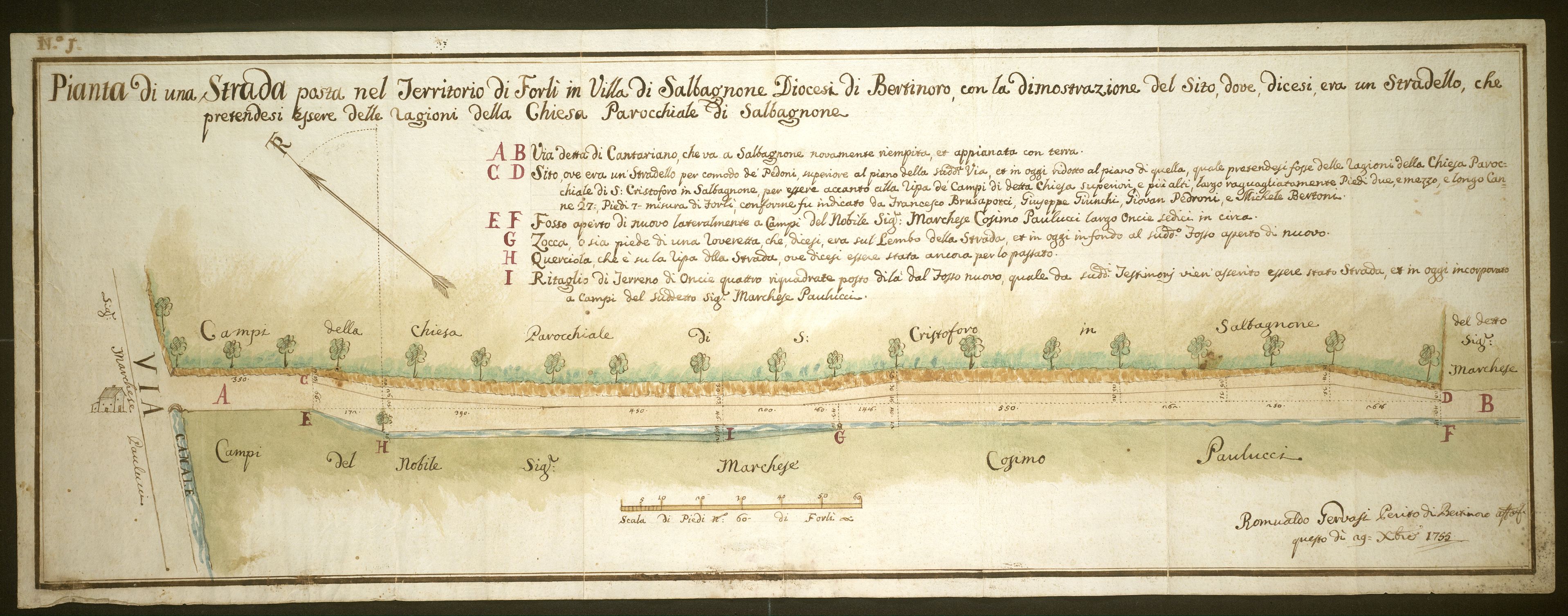 Pianta di una strada posta nel territorio di Forlì in villa di Salbagnone diocesi di Bertinoro con la dimostrazione del filo dove dice si era uno stradello che pretendevasi essere delle ragioni della chiesa parocchiale di Salbagnone. Via di Cantariano. 29 dicembre 1755.