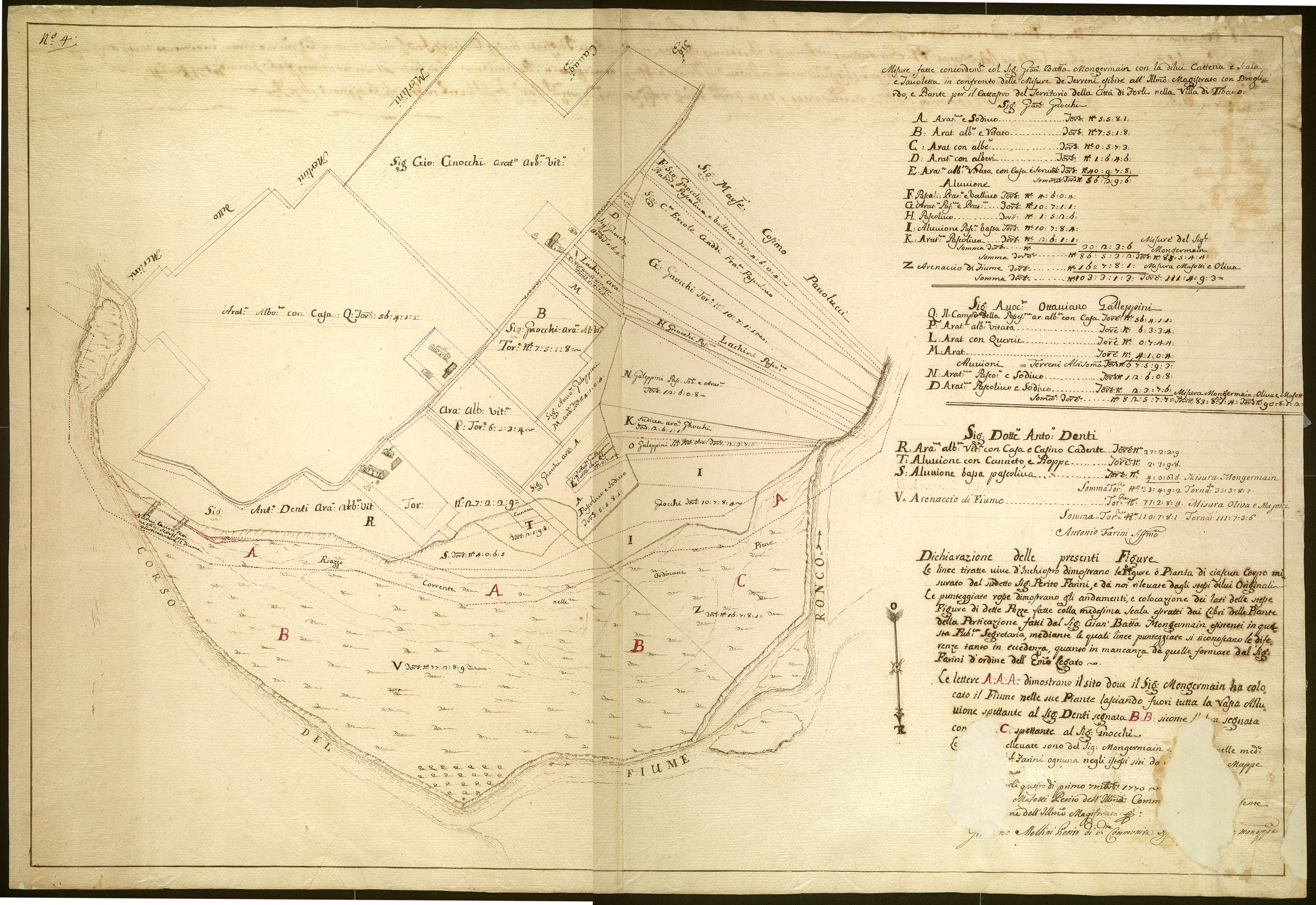 Misurazione delle possessioni Gnocchi Galeppini e Denti tra il Ronco e i beni Merlini in confutazione di perticazione fatta da Gio. Battista Mongermain.
